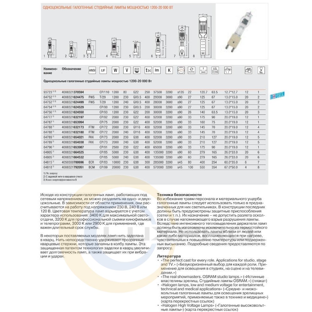 Лампа OSRAM 64805 - одноцокольная галогенні лампи потужністю 5000 Вт для застосування в професійному кіно- і телевізійному виробництві, сфері розваг, для освітлення театральних і концертних сцен. Лампа працює при напрузі 230/240 В.
