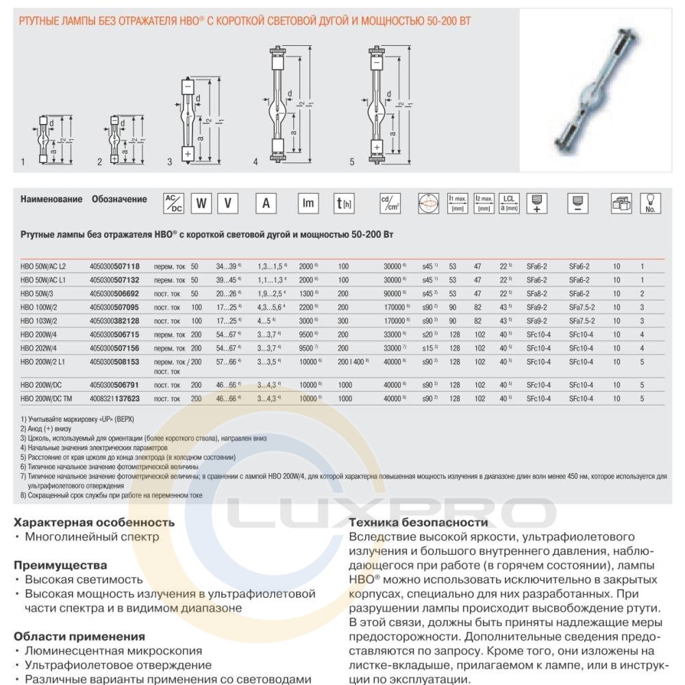 Лампа OSRAM HBO 50W / AC 39V L1 - це короткодуговая лампа без відбивача потужністю 50 Вт, в якій дугового розряд світиться в насиченому парі ртуті та інертного газу під високим тиском.У холодній лампі високий тиск відсутній.Серед особливостей лампи - висока світловіддача, багатолінійний спектр, висока потужність випромінювання в ультрафіолетовому та видимому діапазоні.Робоче положення - вертикально, цоколем вниз з допустимим відхиленням на 45 °.Застосовується в флуоресцентної мікроскопії, УФ-затвердінні і в световодах.Експлуатація лампи дозволена тільки в спеціальних закритих корпусах, що обумовлено її високою яскравістю, ультрафіолетовим випромінюванням і високим внутрішнім тиском при нагріванні.З пошкодженої лампи вивільняється ртуть, тому слід дотримуватися особливих заходів безпеки.Характеристики: