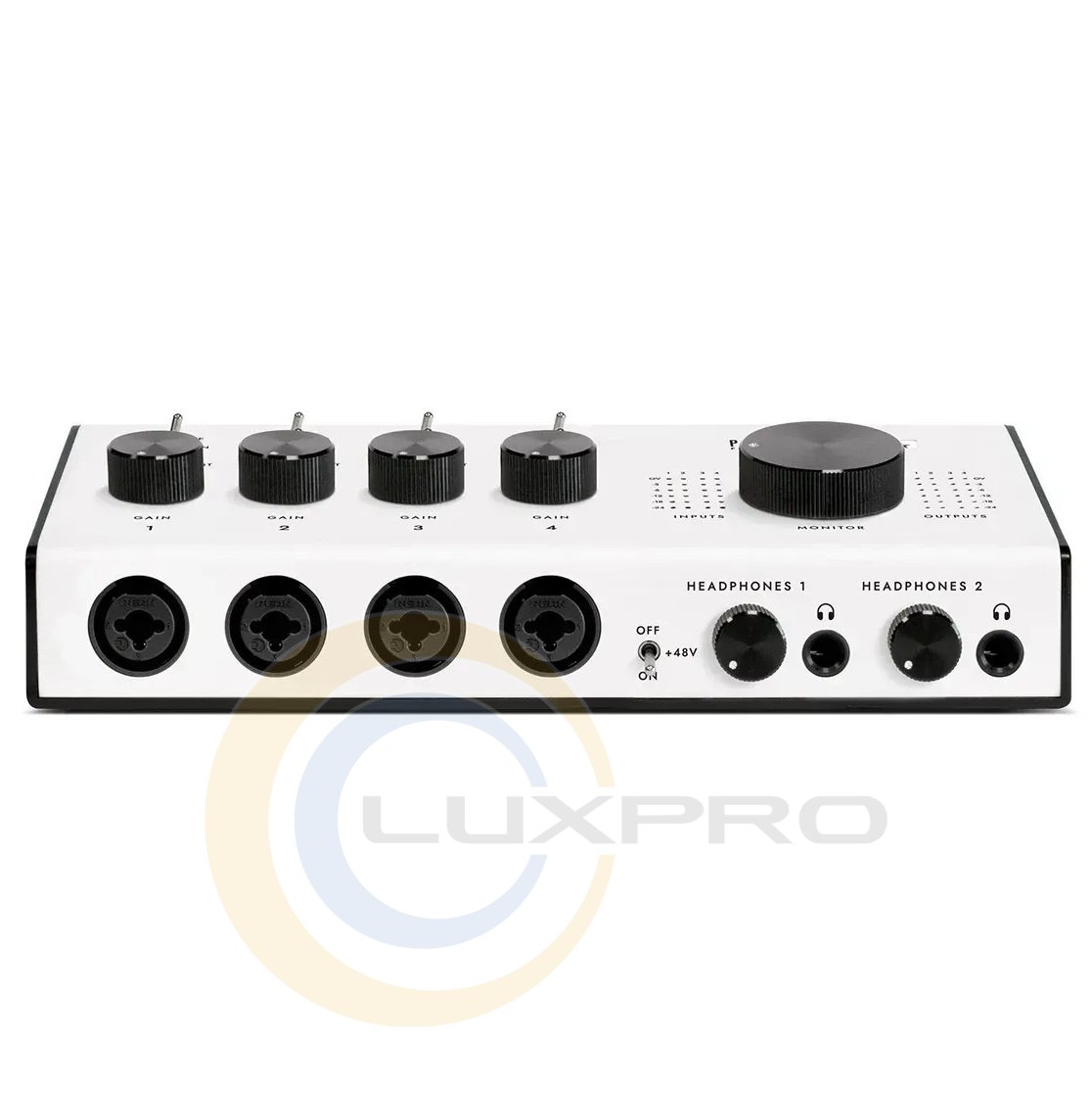 Два високопродуктивні виходи для навушників із незалежним регулюванням рівня та збалансовані виходи для професійного моніторингу дають змогу точно контролювати звук. Фантомне живлення +48 В підходить для роботи з конденсаторними мікрофонами, що розширює можливості інтерфейсу.