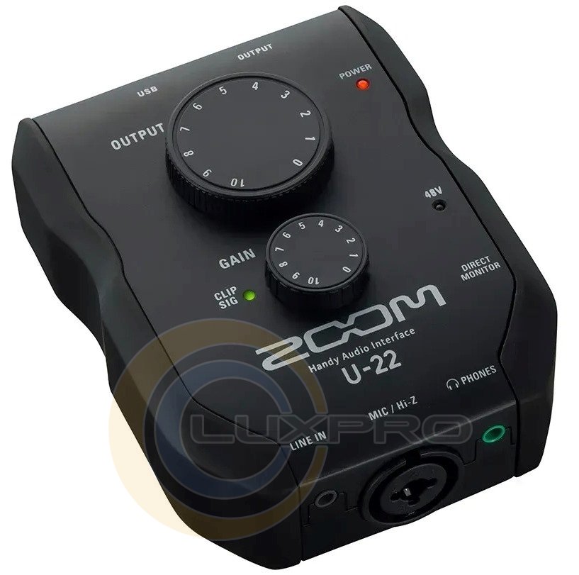 Аудіоінтерфейс U-22. U-22 оснащений такими ж високоякісними і практично безшумними мікрофонними підсилювачами, як і рекордери Zoom H5 і H6, що зарекомендували себе. Підключайте ваш U-22 до ПК, Mac або iPad через USB-порт і використовуйте його як автономний AD/DA конвертер та мікрофонний підсилювач. Якщо живлення від шини USB неможливе, то U-22 може живитися лише від двох пальчикових батарейок, тому його завжди можна взяти із собою.