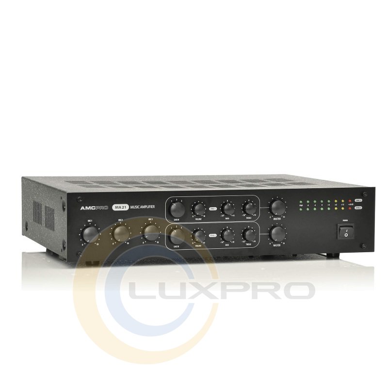 MA21 - двозонний мікшерний підсилювач з окремим тоном і регулятором гучності для кожної зони. Має два вбудованих виходи трансформатора для ліній з опором 100 В. Ці підсилювачі можна використовувати там, де потрібно дуже точне відтворення звуку, тому що вони мають 8 Ом лінію динаміків і містять окремий вихід для сабвуфера.