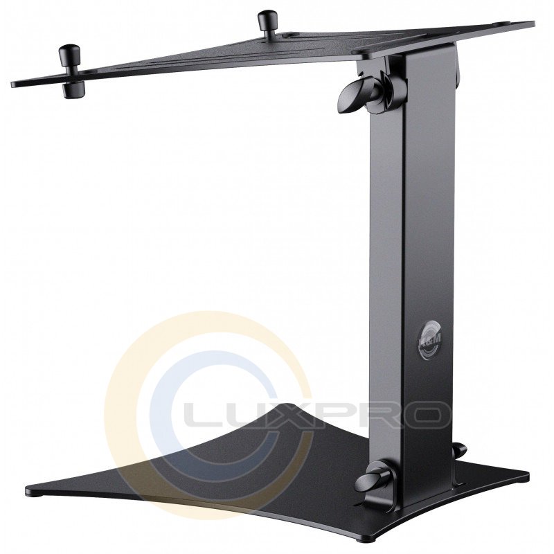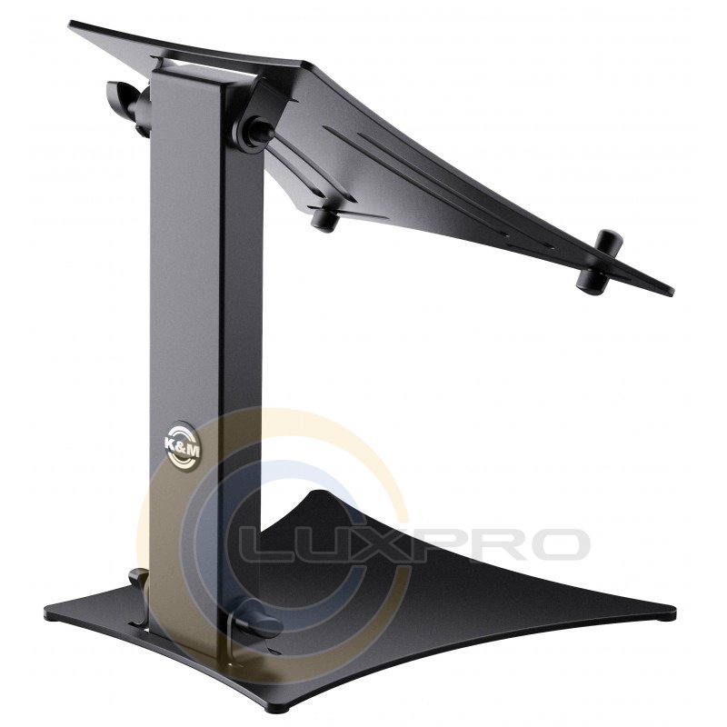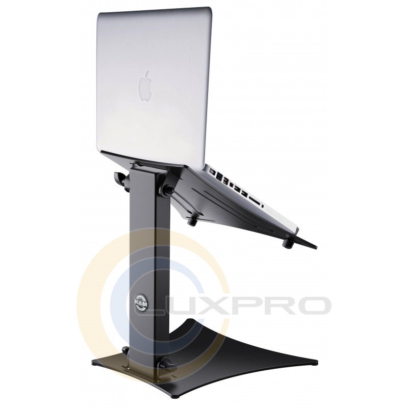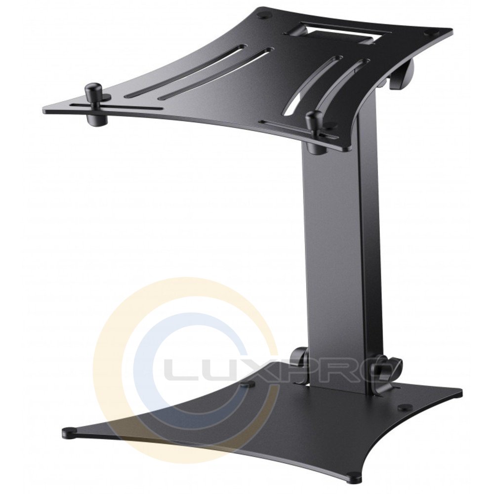 Підставка для ноутбука Laptop stand 12190-024-56 - Black. Міцна конструкція із сталевих труб у поєднанні з привабливими алюмінієвими ніжками та опорною пластиною забезпечує відмінну стійкість, незважаючи на невелику вагу. Індивідуально регульовані штифти з гумовими ковпачками дозволяють використовувати всі поширені моделі ноутбуків, мікшерів, CD-плеєрів і т. д. Висота по горизонталі становить 320 мм, а нахил регулюється з кроком 8 °. У комплект поставки входять гумові накладки, що не ковзають.