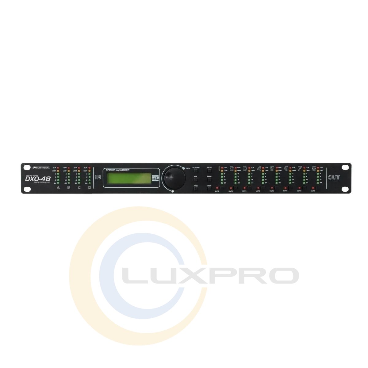 Цифровий контролер OMNITRONIC DXO-48E. Підтримує різні типи фільтрів (Bessel, Butterworth, Linkwitz-Riley), зберігання користувацьких пресетів і управління як з панелі, так і через ПК по USB. Компактний 19″ корпус висотою 1U робить його зручним для установки в рекову стійку, а широкі можливості конфігурації дозволяють використовувати його в концертних залах, клубах, студіях і системах інсталяції.