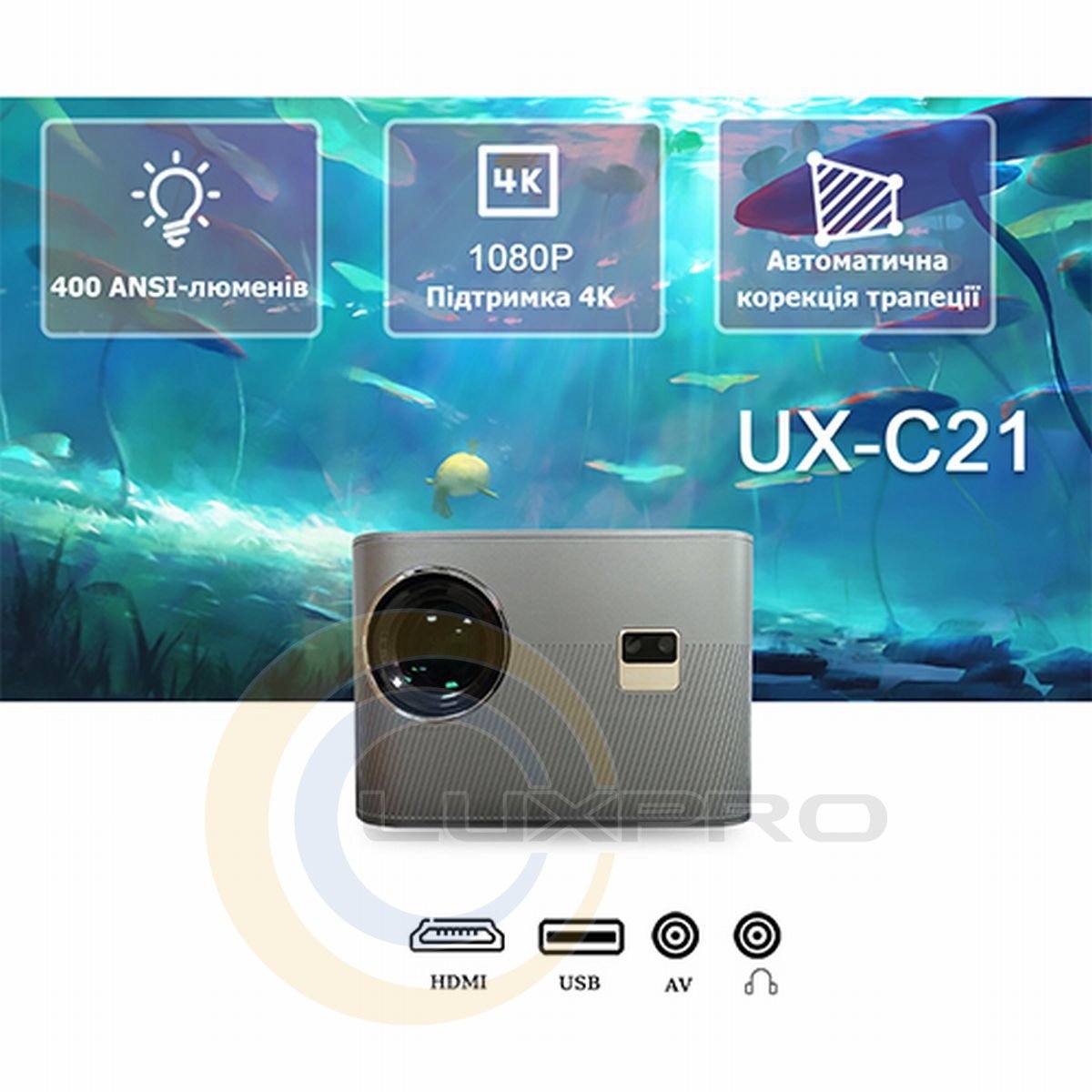 Відео проектор UX-C21. Проєктор має вбудовану операційну систему Android 9 і функцію SMART TV, що відкриває доступ до популярних стрімінгових сервісів без додаткових пристроїв. Ви можете легко підключати його до Wi-Fi або Bluetooth 5.0 для бездротової передачі контенту. Автоматичне фокусування та корекція трапеції по вертикалі та горизонталі спрощують налаштування зображення. Компактні розміри (220 x 195 x 154 мм) та вага лише 2,1 кг роблять пристрій зручним для перенесення.Мультимедійний проектор UX-C21 підтримує діагональ проекції від 40" до 200", що дозволяє організувати перегляд фільмів, спортивних трансляцій або ігор у великому форматі. Якісні вбудовані динаміки 5 Вт х2 забезпечують чистий звук без потреби у зовнішній акустиці. Проектор сумісний із різними форматами відео та аудіо, а інтерфейси HDMI, USB, AV і LAN дають змогу підключати ноутбуки, ігрові консолі чи інші пристрої.Характеристики: