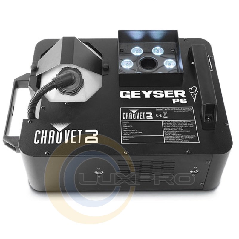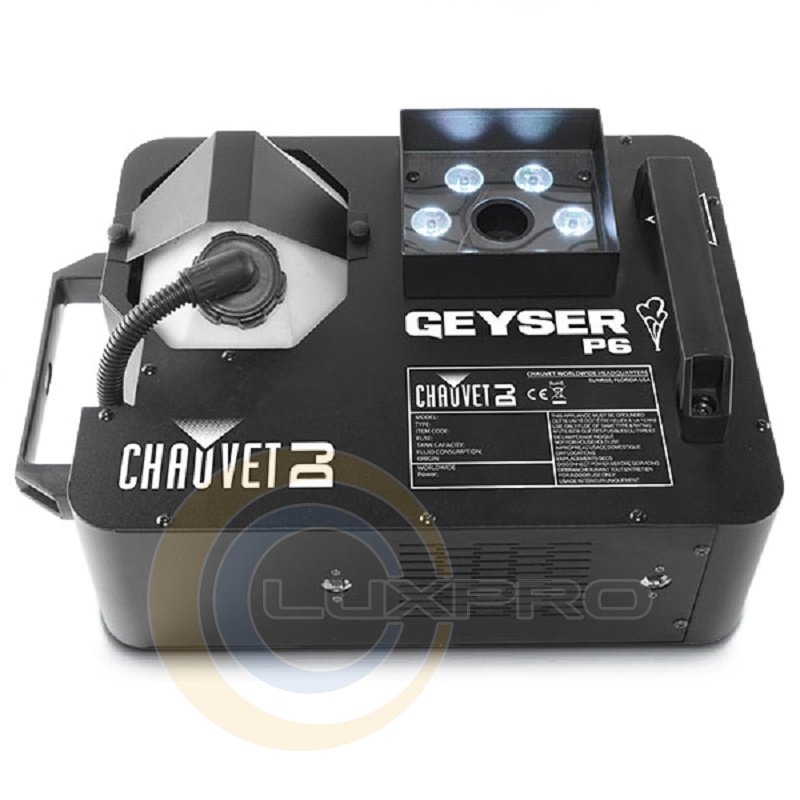 Geyser P6 створює динамічний і безпечний ефект, подібний піротехнічному - без використання токсичних хімікатів, вогню або сухого льоду. Комбінація потужних п'ятикольорових (RGBA + UV) світлодіодів дозволяє вам легко домогтися необхідного кольору заливки, перетворюючи стовп диму в приголомшливий ефект. Технологія швидкого запуску дозволяє максимально точно розрахувати час спрацьовування, що особливо важливо при проведенні динамічних шоу.Особливості: