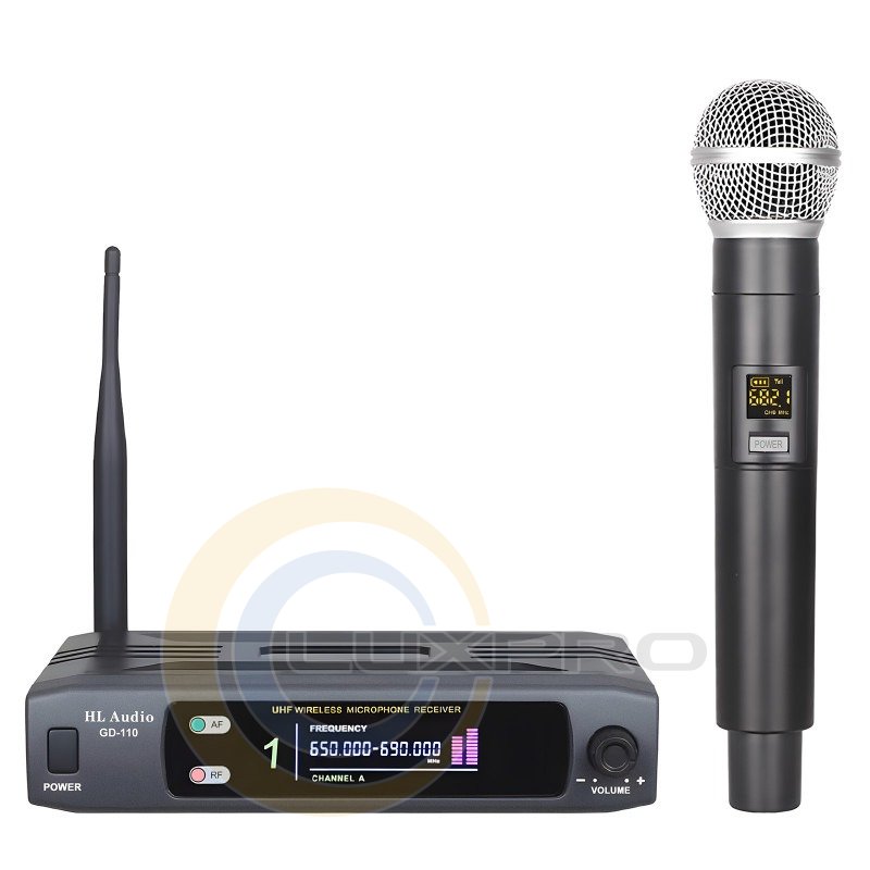 Радіосистема GD-110. Компактний приймач обладнаний антеною, LED індикаторами радіо та аудіосигналу, а регулятором гучності. Розміщені на задній панелі виходи XLR і 1/4" джек дозволяють легко підключити GD-110 до більшості мікшерних пультів, домашніх кінотеатрів, систем караоке або активної акустики.