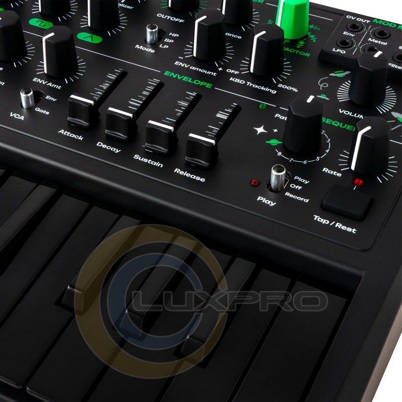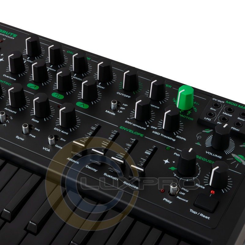 Фільтр Steiner-Parker з режимами, що перемикаються (low-, high- і band-pass) дозволяє гнучко формувати звук, а Brute Factor™ додає агресивну насиченість і ефект зворотного зв'язку. Вбудований 64-кроковий секвенсор та патч-матриця CV/Gate надають напівмодульну гнучкість та просту інтеграцію з модульними системами – без комп'ютера.