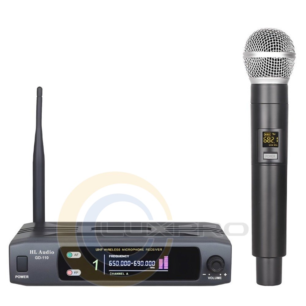 Мікрофонна радіосистема GLXD4. Компактний приймач обладнаний антеною, LED індикаторами радіо та аудіосигналу, а регулятором гучності. Розміщені на задній панелі виходи XLR і 1/4" джек дозволяють легко підключити GD-110 до більшості мікшерних пультів, домашніх кінотеатрів, систем караоке або активної акустики.