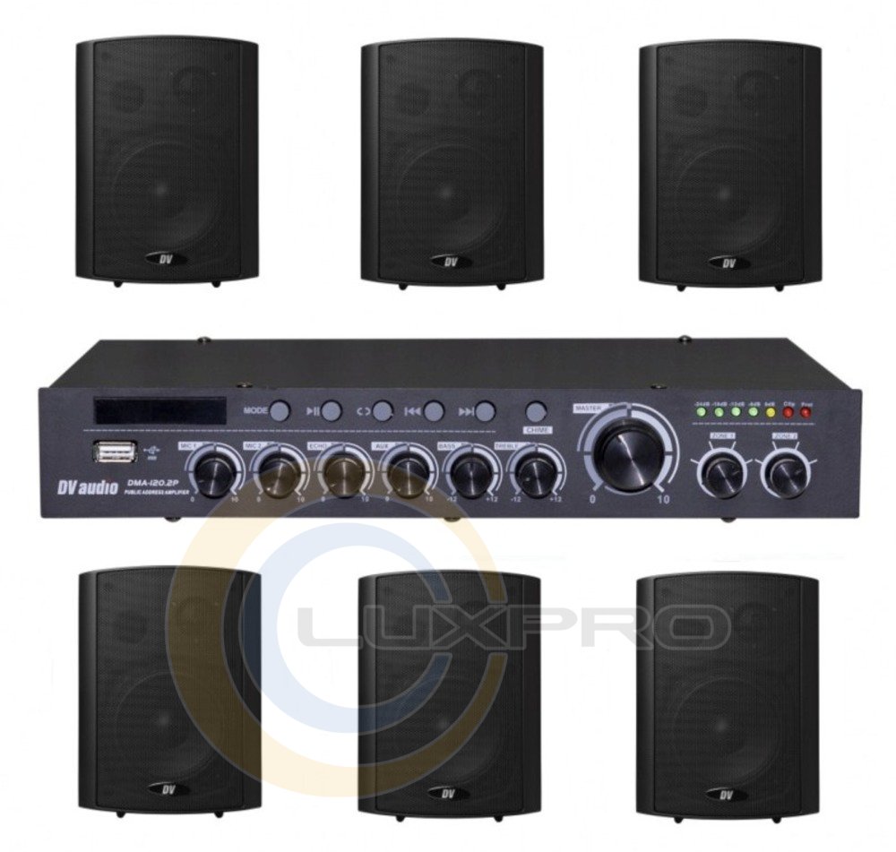 Комплект звуку DMA1206422B для приміщення до 180м.кв. Комплект для фонового озвучування приміщень, офісів, кафе та відкритих майданчиків середньою площею 180 кв. м. У комплект входить пристрій відтворення звуку на АС та набір акустичних систем.