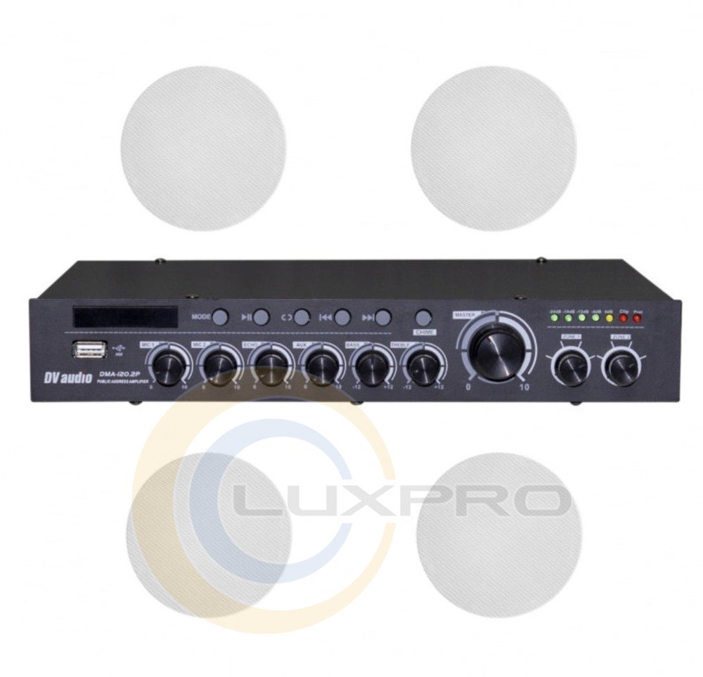 Комплект звуку DMA1204CMG6W для приміщення до 120 м.кв. Комплект для фонового озвучування приміщень, офісів, кафе та відкритих майданчиків середньою площею 120 кв. м. У комплект входить пристрій відтворення звуку на АС та набір акустичних систем.
