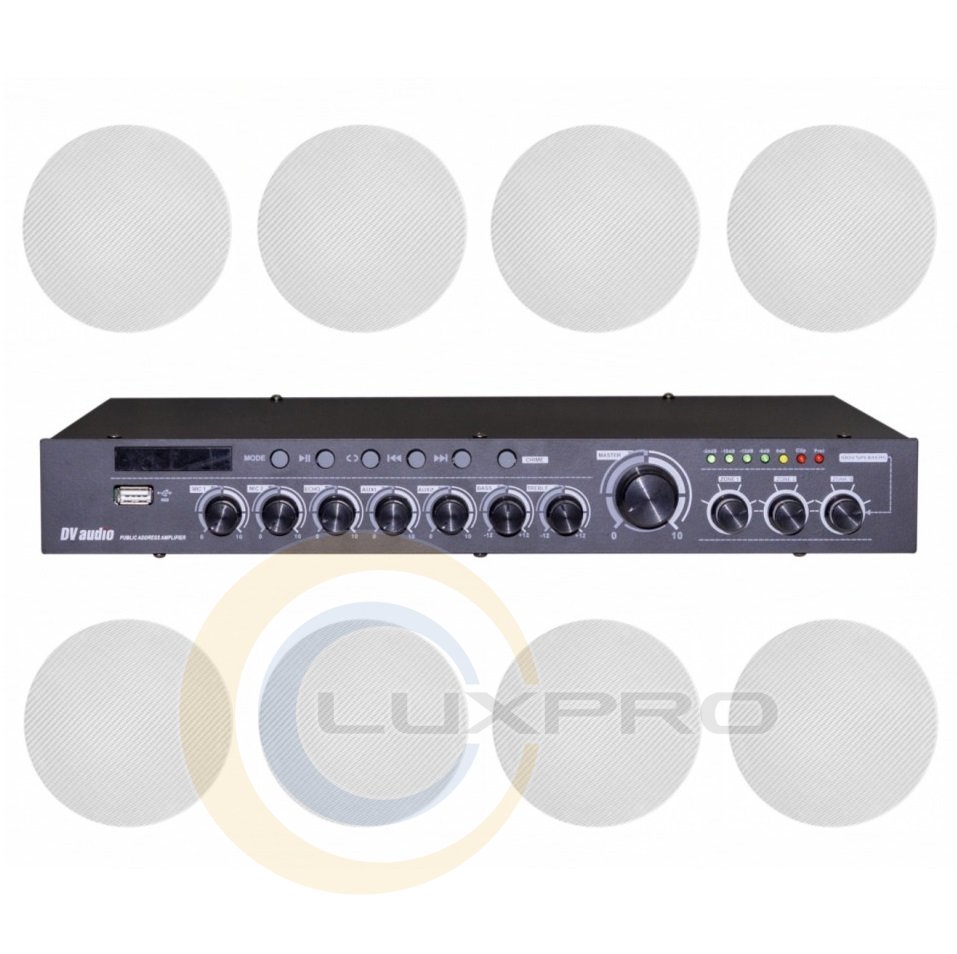 Комплект звуку DMA2408CMG6W для приміщення до 180 м.кв. Комплект для фонового озвучування приміщень, офісів, кафе та відкритих майданчиків середньою площею 240 кв. м. У комплект входить пристрій відтворення звуку на АС та набір акустичних систем.