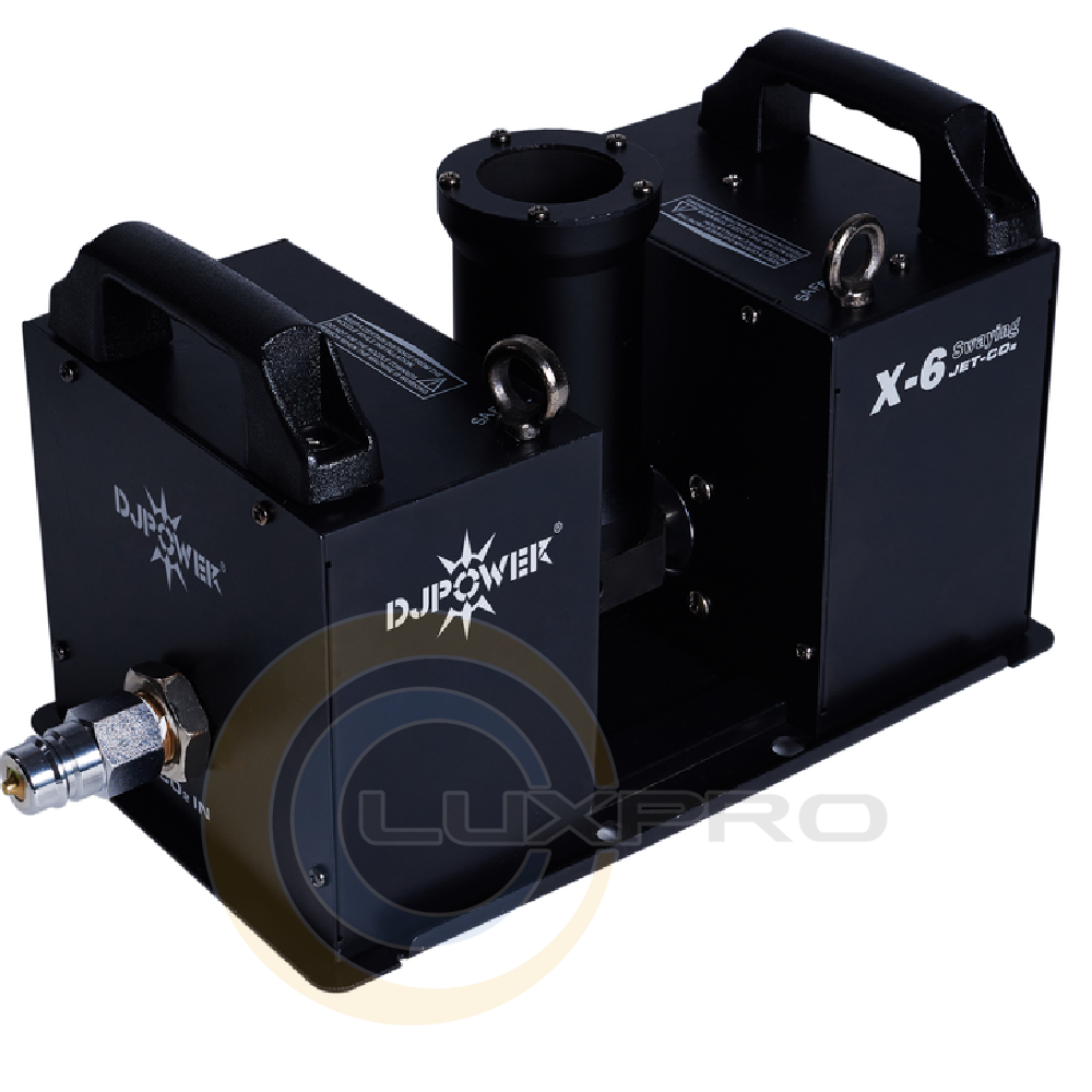 Генератор CO2 X-6 (2 in 1) являє собою компактний і мобільний генератор СО2. Це дозволяє нам легко перенаправляти струменевий викид (180 градусів). Простота в експлуатації, два блоки з'єднані один з одним і управляються DMX (включений, ціна за одиницю). Незважаючи на високу продуктивність (розряду до 8 м), пристрій працює дуже тихо.