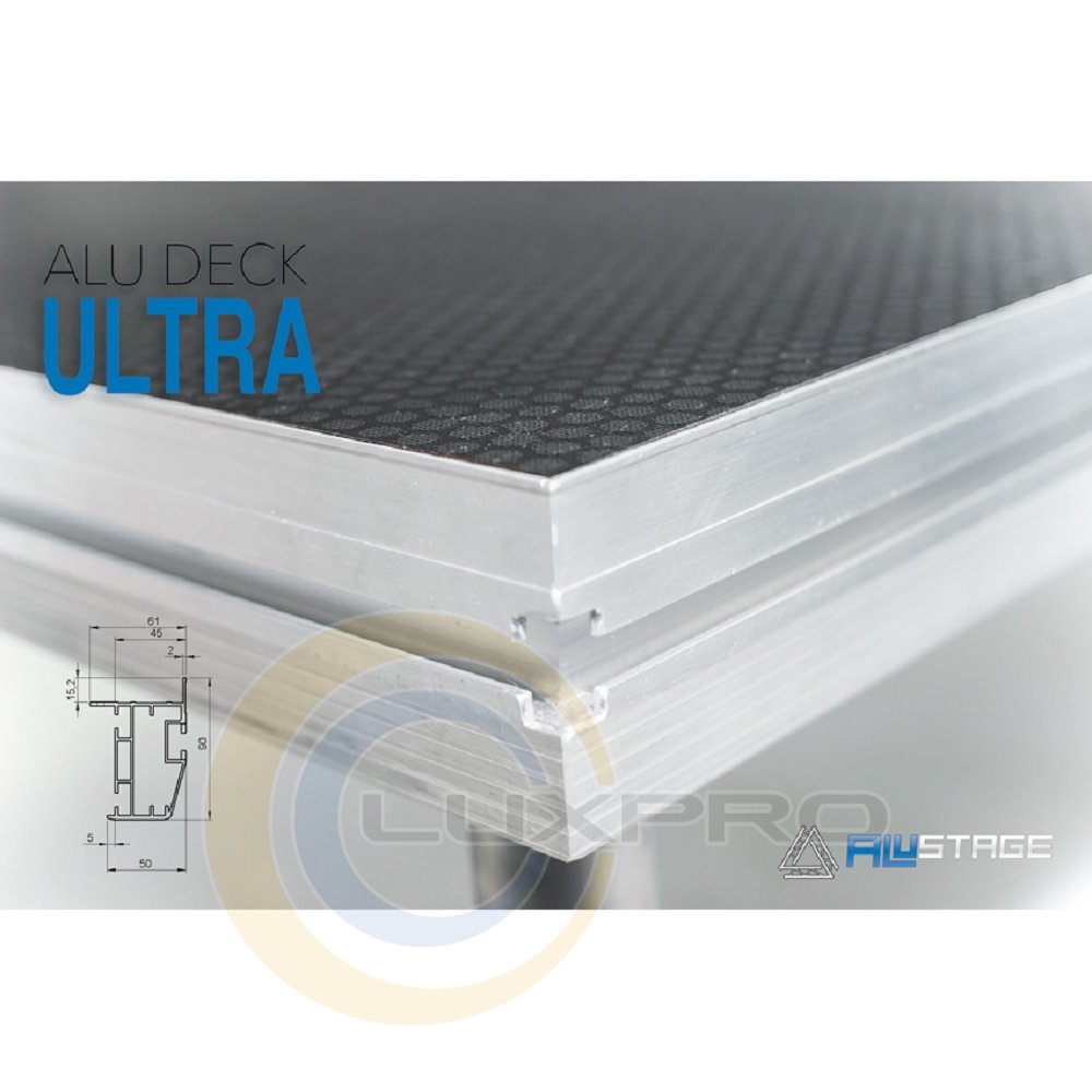 Платформа Stage AluDeck Ultra є базовою платформою компанії Alustage, призначена для спорудження сцен, подіумів для показу мод, залу для глядачів, платформ для проведення конференцій. Доступні розміри: 2.0x1.0 м (стандарт) / 2.0x0.5 м / 1.0x1.0 м / 1.0х0.5 м / 0.5х0.5 м і нестандартних розмірів. Спеціальна конструкція AluDeck Ultra забезпечує міцність 750 кг / м2, що підтверджується TUV сертифікатом.