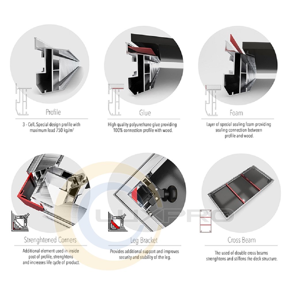 Нова платформа Stage AluDeck Ultra не тільки легше AluDeck HD, але і сумісна з AluDeck Light. Її вага становить всього 32 кг. Дві поздовжні балки і спеціальна конструкція профілю забезпечують повну стабільність. Найвища якість підтверджено сертифікатом TUV, яке забезпечує максимальну безпеку.