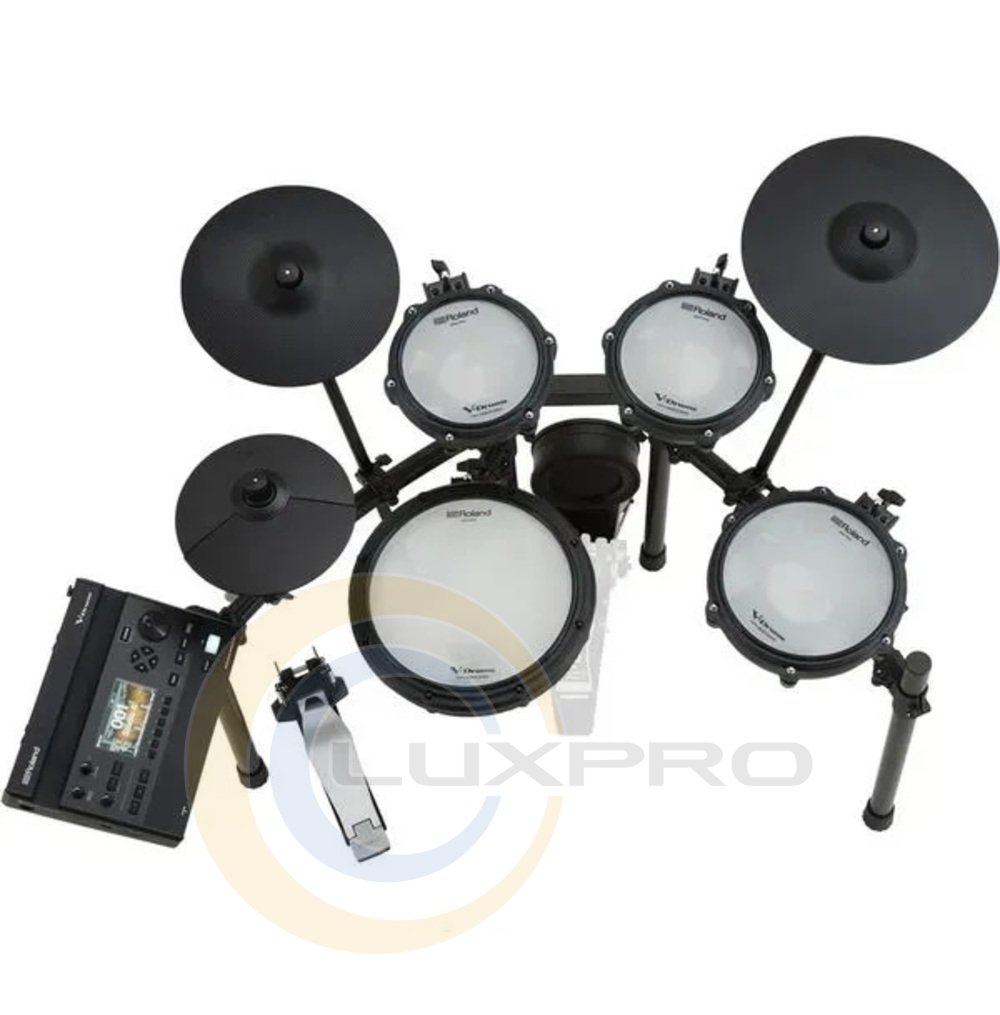 У комплекті використані сітчасті мембрани Roland Mesh із регульованим натягом — вони створюють натуральний відскок паличок і дають змогу виконувати всі динамічні техніки, включно з ghost notes, rim-shot і cross-stick. Ударні пади мають точні сенсори, які чітко зчитують навіть легкі удари, а тарілки CY-8 підтримують затиск (choke) і природне загасання.