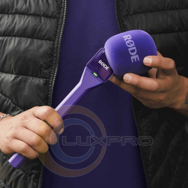 Мікрофонний тримач Interview GO Purple оснащений міцним кріпленням для затиску Wireless GO, щоб закріпити його на місці, а також вітрозахисту високої щільності для зменшення вибухових звуків та захисту капсуля від вітру під час запису на відкритому повітрі.