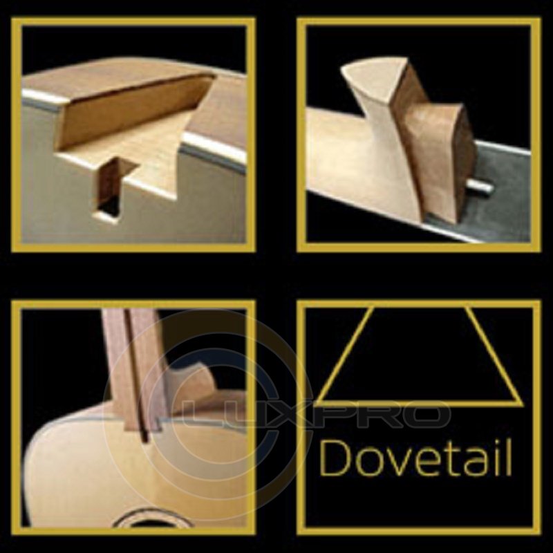 Завдяки яскравому, але щільному звучанням з вираженим среднечастотним діапазоном, червоне дерево стало стандартом для виготовлення обечайки і нижньої деки акустичних гітар.Незважаючи на те, що багате звучання цільної деревини залишається неперевершеним, конструкція з ламінованого дерева також може забезпечити відмінне звучання прекрасного надійного і доступного інструменту. Одна з переваг застосування такої конструкції - неймовірна стійкість навіть до різких перепадів вологості.Кріплення грифа до корпусу типу "ластівчин хвіст" (Dovetail Neck Joint)