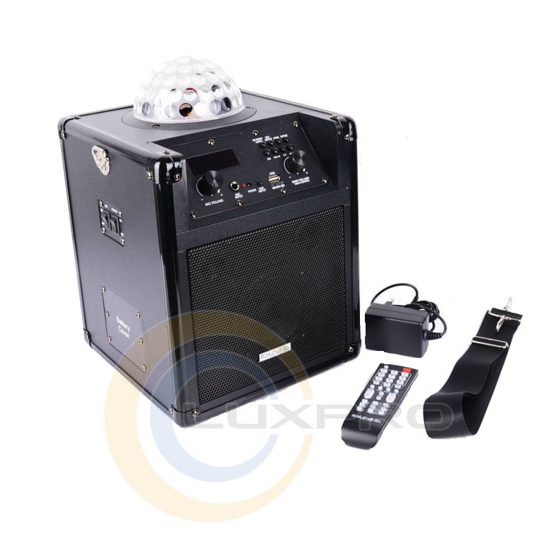 Портативна переносна акустична система KUBE60-BK з живленням від вбудованого акумулятора або від мережі живлення, з підсилювачем і світловим ефектом RGB для мобільного і караоке використання.