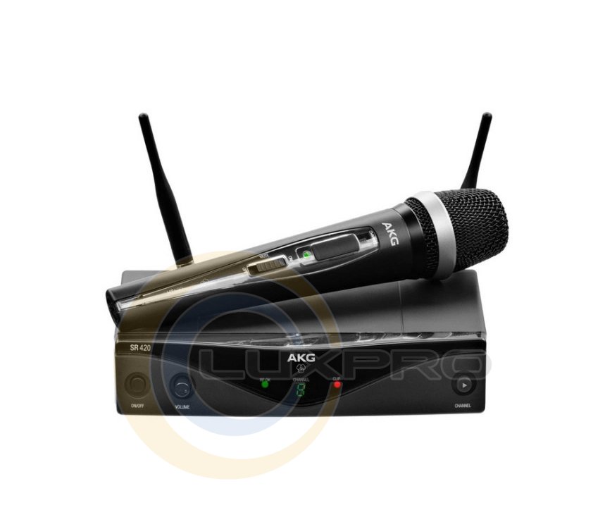AKG WMS420 VOCAL SET Band A - бездротовий мікрофонний набір, розроблений для публічних виступів, презентацій, інсталяцій та сірників, яким необхідно до восьми одночасно працюючих систем зі смугою пропускання 30 МГц. Він складається з динамічного бездротового передавача PT420, стаціонарного УВЧ-приймача SR420, двох радіочастотних знімних антен, адаптера змінного струму для приймача і батареї розміру AA для передавача.