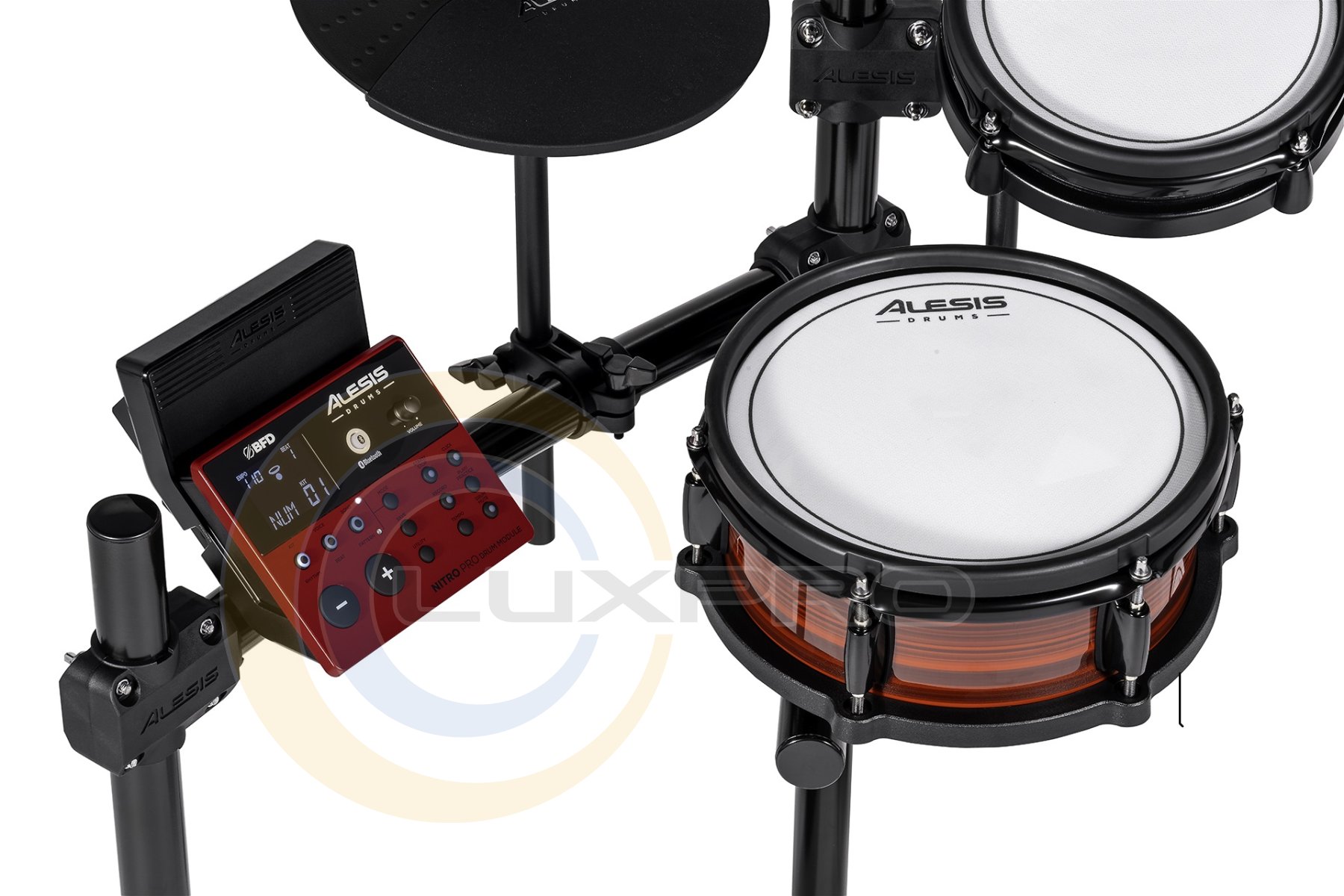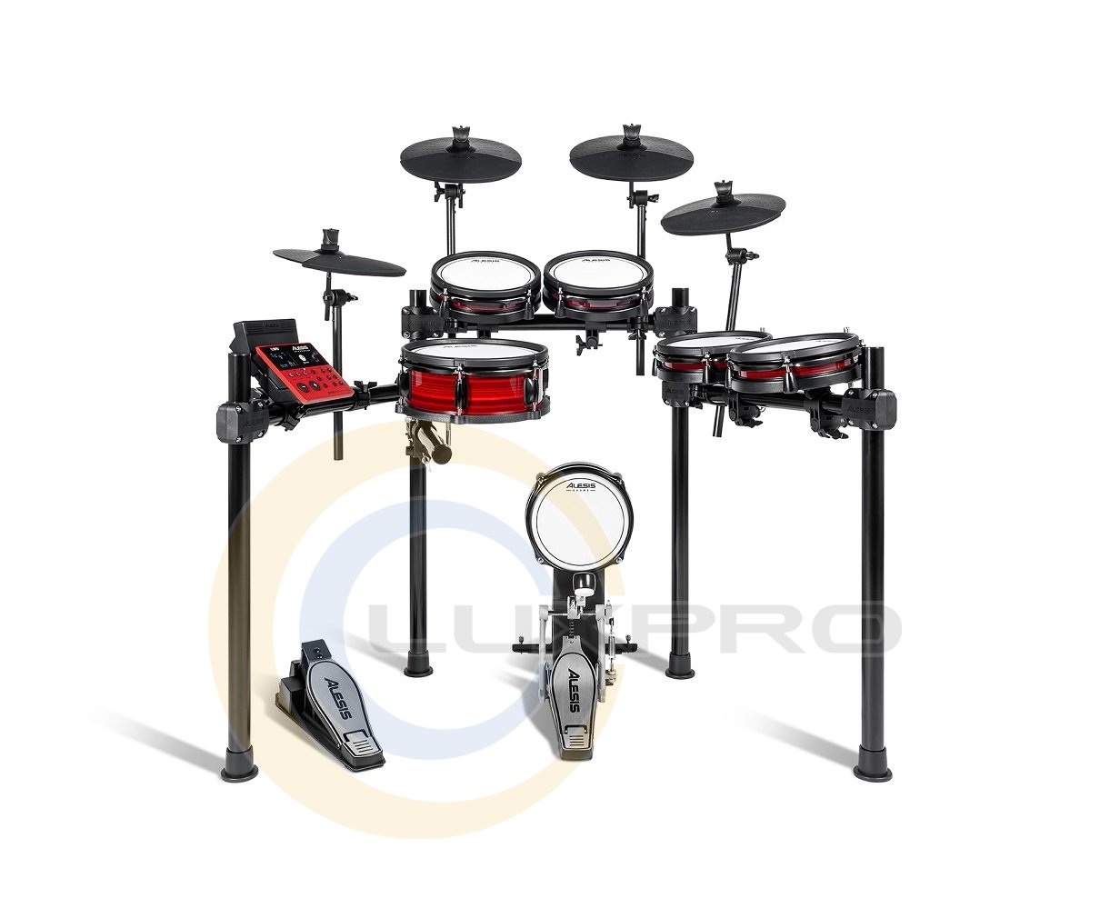 Комплектація: Модуль NITRO PRO, 10" сітчастий двозонний глибокий пед робочого барабана, 4х 8" сітчасті двозонні педи томів, 8" сітчастий вертикальний пед бас-барабана, 2х 10” пед крешу (із заглушенням), 10” пед райду (із заглушенням), 10” пед хай-хету, педаль для бас-барабана, педаль-контролер хай хета, Металева рама з 4 ніжками, блок живлення, барабанні палички, барабанний ключ.
