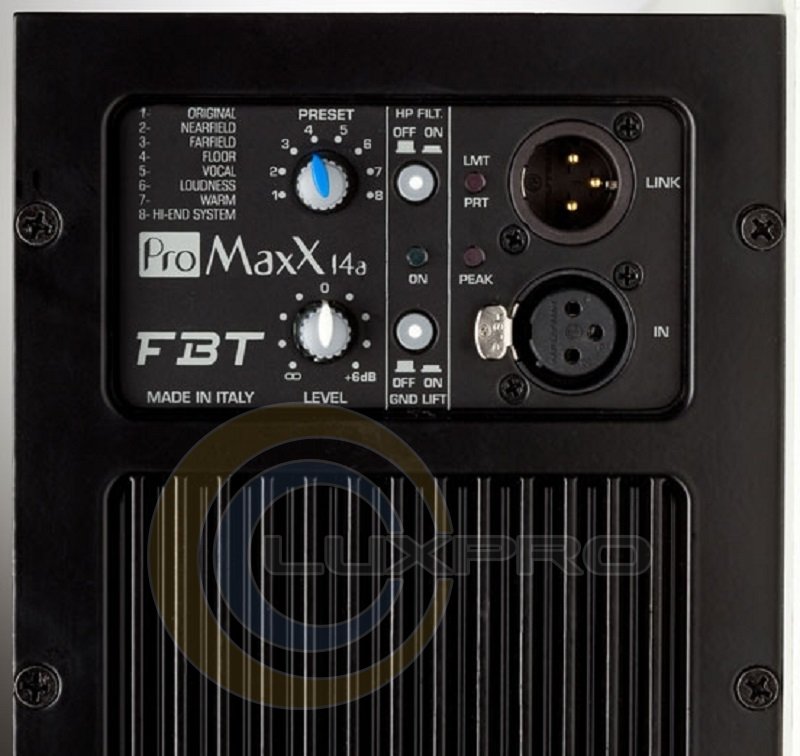 FBT ProMaxX 10 A виготовлено за особливою технологією з корпусом, який майже виключає можливість резонансу. Кут нахилу монітору складає 12°, 40° і 55°, що дає можливість використовувати систему як сценічний монітор.Систему оснащено низькочастотним десяти дюймовим динаміком та одно дюймовим драйвером. За рахунок точної розробки та якісного виконання фірмою B&C, забезпечується поліпшена корекція та рівномірне розсіювання з покриттям 90х60 градусів.Потужність низькочастотного транслятора системи становить 600 Вт, а високочастотного 300 Вт, в той час як звуковий тиск становить 131дБ. Вищезазначені характеристики дозволяють використовувати систему для озвучення середніх за розміром приміщень та майданчиків.Для підвищення зручності у використанні та функціональності системи, її оснащено вісьмома пресетами:- ORIGINAL - має стандартні налаштування,