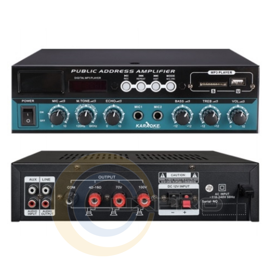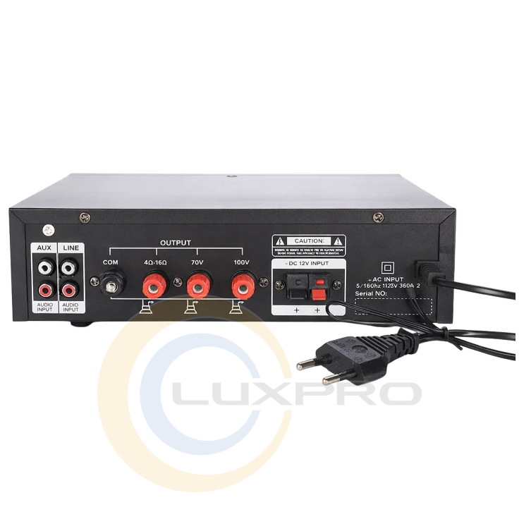 Підсилювач потужності FS-206S. Оснащений вбудованим MP3-плеєром з підтримкою USB/SD-карток та Bluetooth, двома мікрофонними входами з реверберацією, регулюванням тембру та гучності. Підтримує виходи на 100 В та низькоомні 4-16 Ом, має лінійний вихід та подвійне живлення (220 В або 12 В). Ідеально підходить для об'єктів, де потрібне зональне озвучування, якісний мікрофонний звук з ефектами, бездротова музика та можливість резервного живлення.