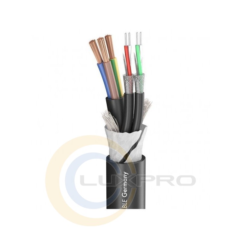 Кабель 500-0281-2 + (XLR/PowerCon). В основі використовується Sommer Cable 500-0281-2 з силовим каналом 3×2,5 мм² та двома повноцінними DMX-лініями з хвильовим опором 100 Ω, що забезпечує стабільну роботу без перешкод та надійне живлення при каскадному підключенні обладнання.