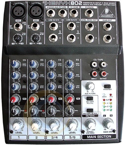 Мікшерний пульт XENYX 802 компактний мікшерний пульт з ультранизьким рівнем шумів і великим динамічним діапазоном. 2 високоякісних мікрофонні зовнішній підсилювач XENYX. Неокласичні еквалайзери англійського типу і тепле аналогове звучання. По 1 посилу post fader на всіх вхідних каналах і 1 стереовход повернення. Основний стереовиход, стереовиходи CD / tape, Control room і гніздо для підключення навушників. Високоякісні компоненти і виключно міцна конструкція.