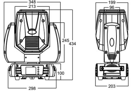 Вхідна напруга: AC90 / 260V 50 / 60Hz, кількість ламп: 1 лампа OSRAM 270W, DMX512, master-slave і звукова активація, вбудовані програми, 13/15 DMX USITT DMX каналів управління, master-slave, звукової активації, 8 вбудованих програм, споживана потужність: 330 Вт, розміри: 203х348х434 мм, вага: 13,2 кг.