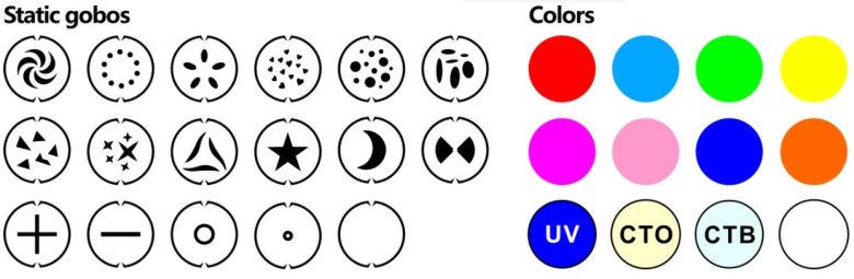 - 1 колесо гобо статичну, 16 гобо плюс відкритий;