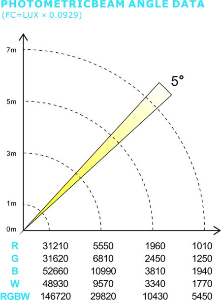 Вхідна напруга: AC200 / 220V 50-60Hz, джерело світла: 25 CREE XLamp XML RGBW 4-в-1 світлодіодів по 10Вт кожен, DMX512, ARTNET, master-slave і звукова активація, вбудовані програми, 23/33/121 DMX каналів управління , споживана потужність: 300 Вт, розміри: 300х380х490 мм, вага: 14,6 кг.