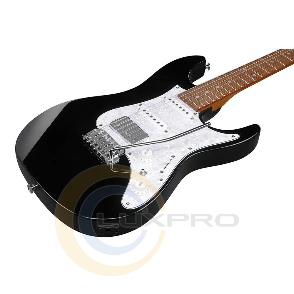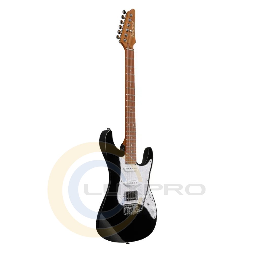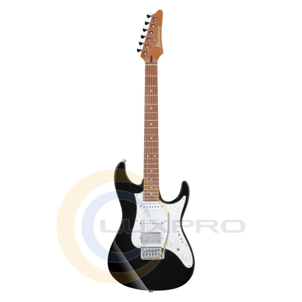 Електрогітара AZ22S2-BK. Корпус із вільхи забезпечує збалансований, відкритий тембр із яскравою атакою та тривалим сустейном. Гриф із термообробленого клена (Roasted Maple) вирізняється високою стабільністю та стійкістю до перепадів температури й вологості, а накладка з ятоби додає насичених середніх частот і чітких верхів. Профіль грифа AZ гарантує максимальний комфорт як для акордової гри, так і для складних сольних партій.