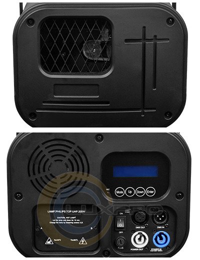 Вхідна напруга: AC90-260V 50/60 Гц, джерело світла: лампа PHILIPS 5R потужністю 189Вт, два режими управління по DMX: 20/22 каналів USITT DMX512, управління по: DMX512, master-slave, звукова активація, вбудовані програми, споживана потужність: 270 Вт, розміри: 348х251х196 мм, вага: 8.5 кг.