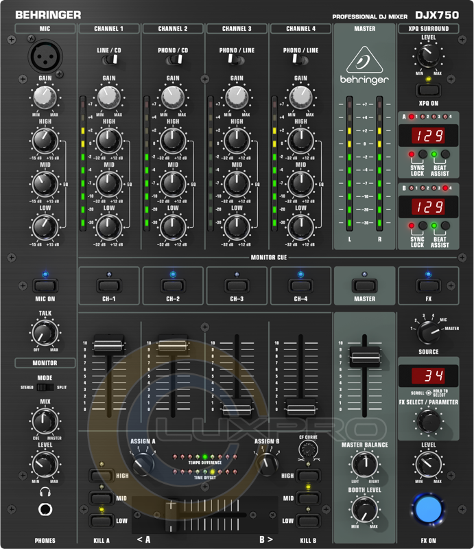 Behringer PRO Mixer DJX 750 – авангард у сьогоднішніх тенденціях у DJ-культурі. Численні функції, серед яких лічильник темпу, комутаційна петля та цифровий процесор ефектів, забезпечать Вас новими креативними можливостями. Створений для професійної роботи, Behringer DJX 750 дуже простий в експлуатації і дає повну свободу дій у Вашій творчості. Behringer DJX 750 ідеально підходить для використання в клубах або як частина DJ-системи і неодмінно принесе Вам масу задоволення.