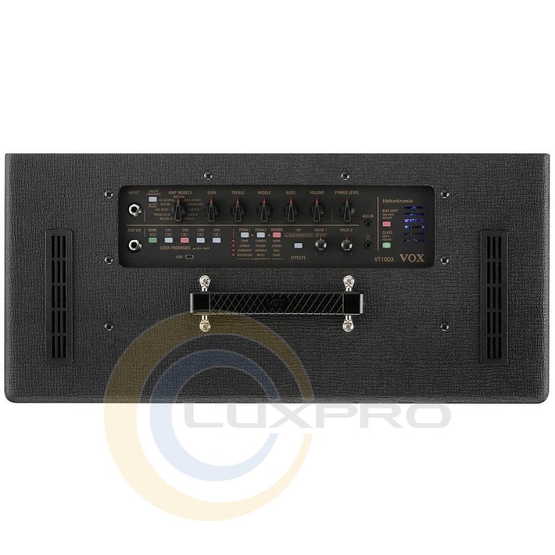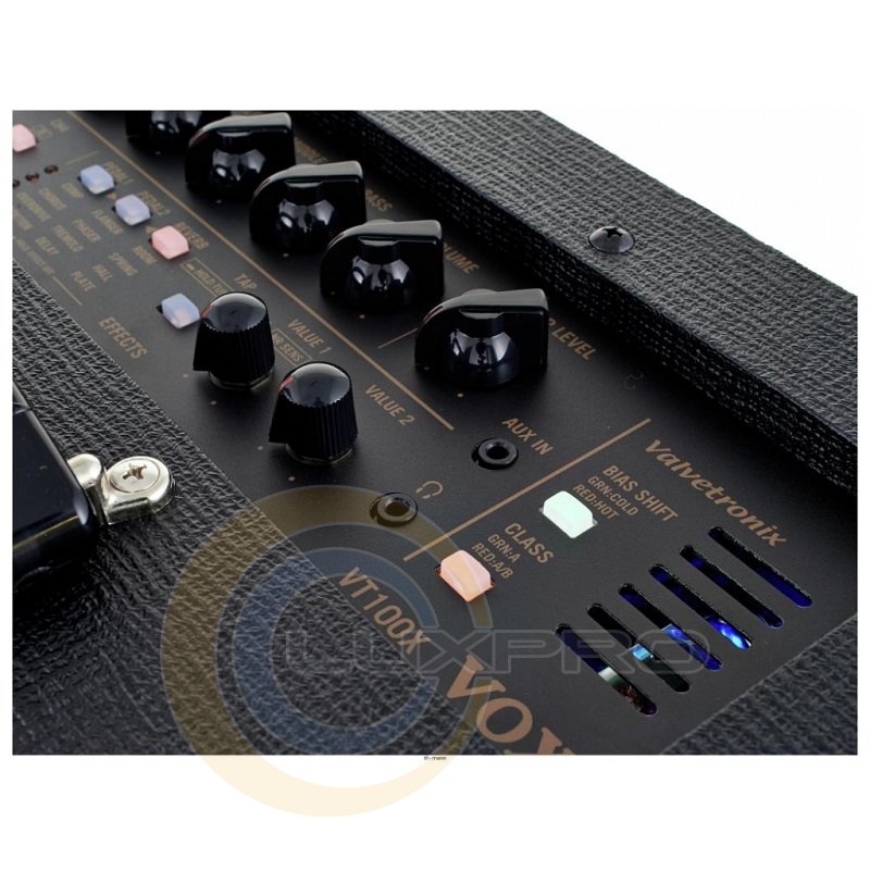 Комбопідсилювач для електрогітари VOX VT100X укладений в закритий кабінет, всередині якого розташований високоякісний 12 '' динамік. Запатентована конструкція фазоінвертора дозволяє домогтися приголомшливого резонансу. Для налаштування параметрів можна використовувати нове програмне забезпечення VOX Tone Room. Це програмне забезпечення дозволяє налаштовувати звук встановлених варіантів підсилювачів і ефектів, а також створювати власні.Дизайн зовнішній підсилювач включає в себе справжню аналогову схему, яка дозволяє домогтися найтоншої тональної коригування і вловити кожен нюанс, що є відмінною рисою лампових підсилювачів. На додаток до цієї розумної схемою, VOX VT100X підсилювач має герметичний корпус і запатентований бас-рефлекс, що надає приголомшливий резонанс. Завдяки новому програмному забезпеченню VOX Tone Room, гітарний комбопідсилювач VOX VT100X значно перевершує попередні моделі, оскільки можна редагувати існуючі підсилювачі і ефекти, а також створювати свої власні.Характеристики: