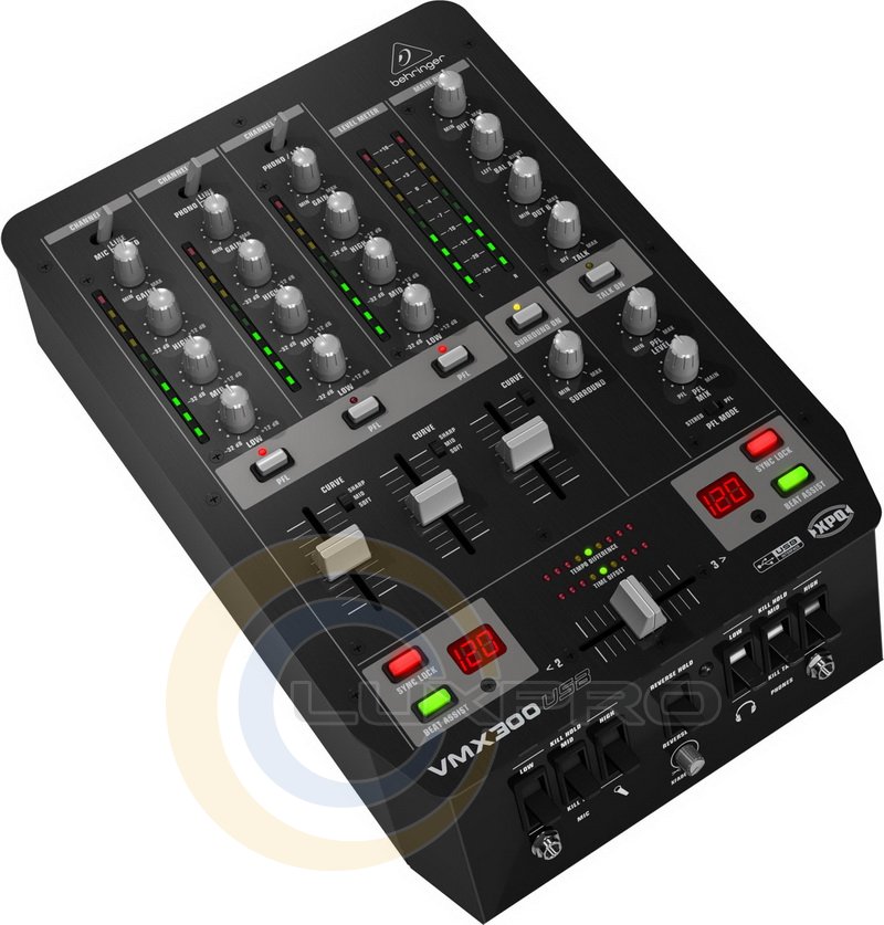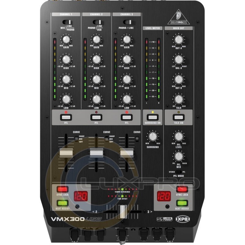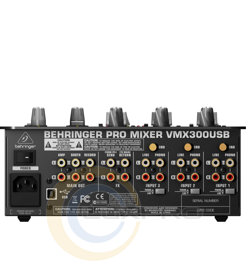 У вхідній секції мікшера BEHRINGER PRO MIXER VMX300USB розташовані 3 набори основних роз'ємів, кожен з яких включає лінійну стереофонічну пару - для під'єднання інструментів, драм-машин і т.д., і стереофонічні phono - для подачі сигналу з "вертушки". Phono-роз'єми забезпечені вбудованими підсилювачами, що гарантують високу якість звуку навіть за низького рівня вхідного сигналу.