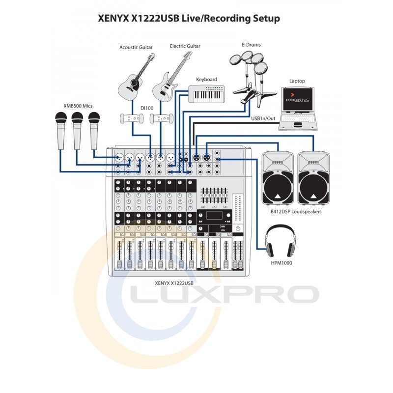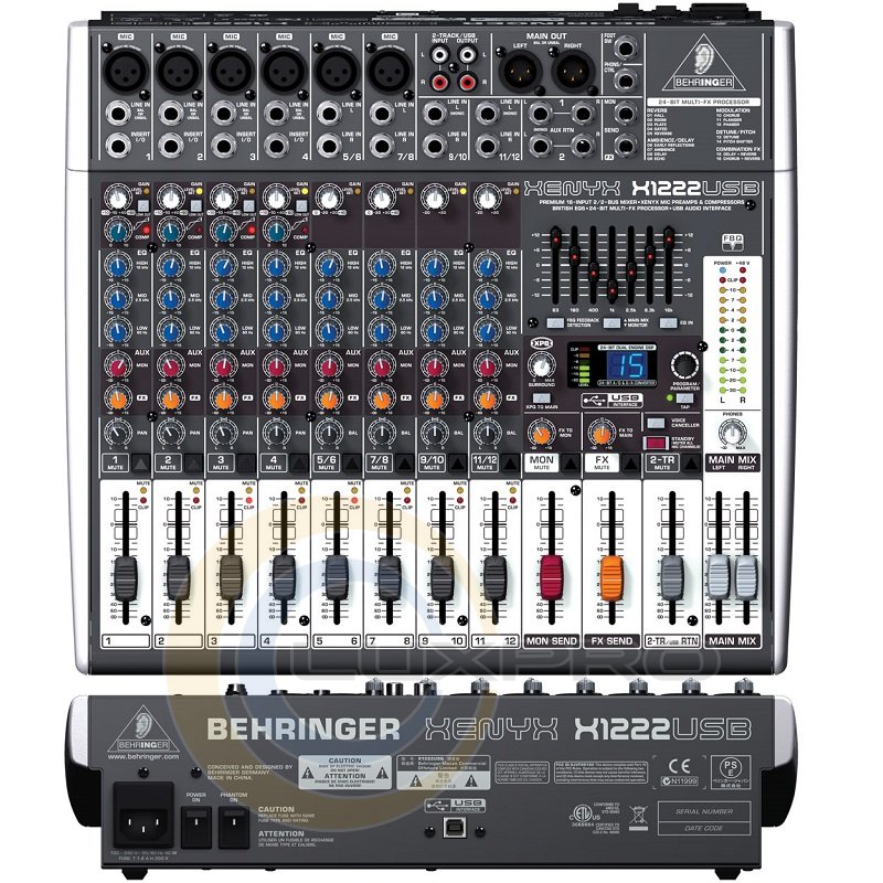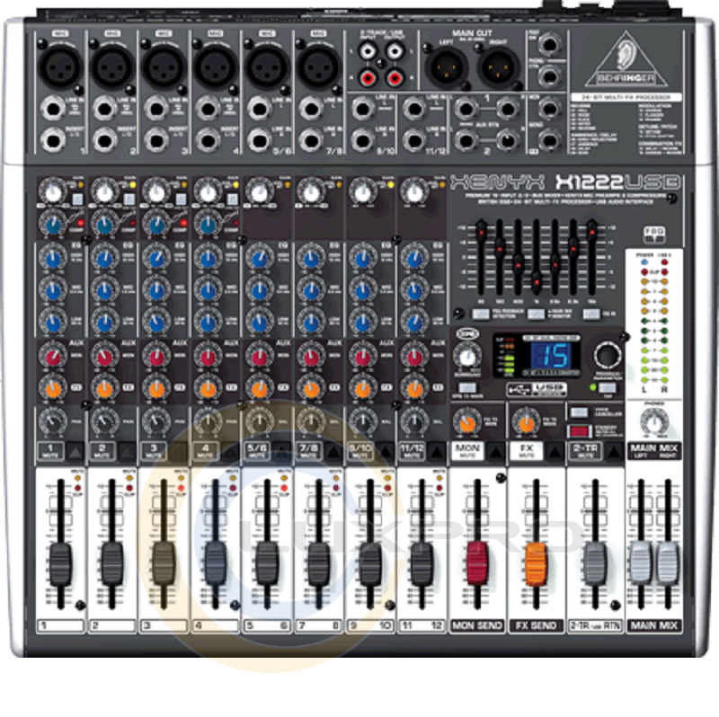 Микшерный пульт X1222USB 12-канальный микшерный пульт с USB интерфейсом и процессором эффектов. 4 XENYX микрофонных предусилителя с фантомным питанием, 4 компрессора, 7-полосный графический эквалайзер для частотной коррекции мониторного или основного "микса". Процессор эффектов с 16 редактируемыми пресетами (включая реверберацию, хорус, фленджер, задержка, Pitch Shifter, мульти-эффекты и длительное хранение параметров настроек пользователя), 150 инструментов/эффектов Plug-Ins. Интегрированный стерео-USB-аудиоинтефейс для прямого подключения к компьютеру