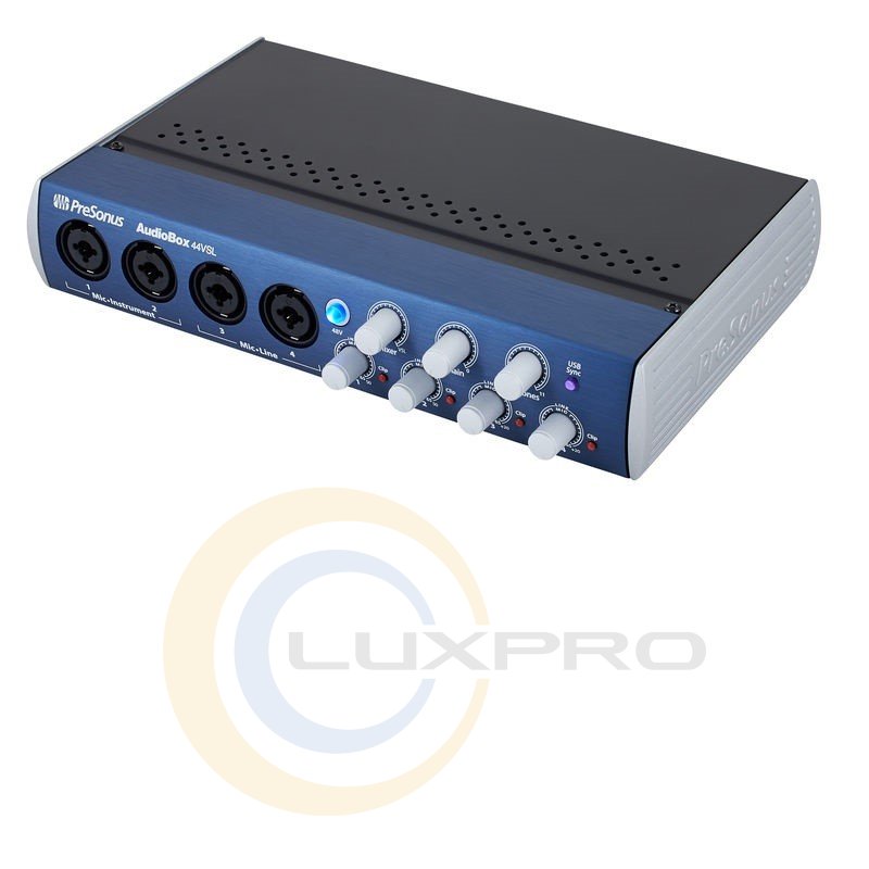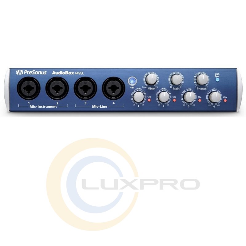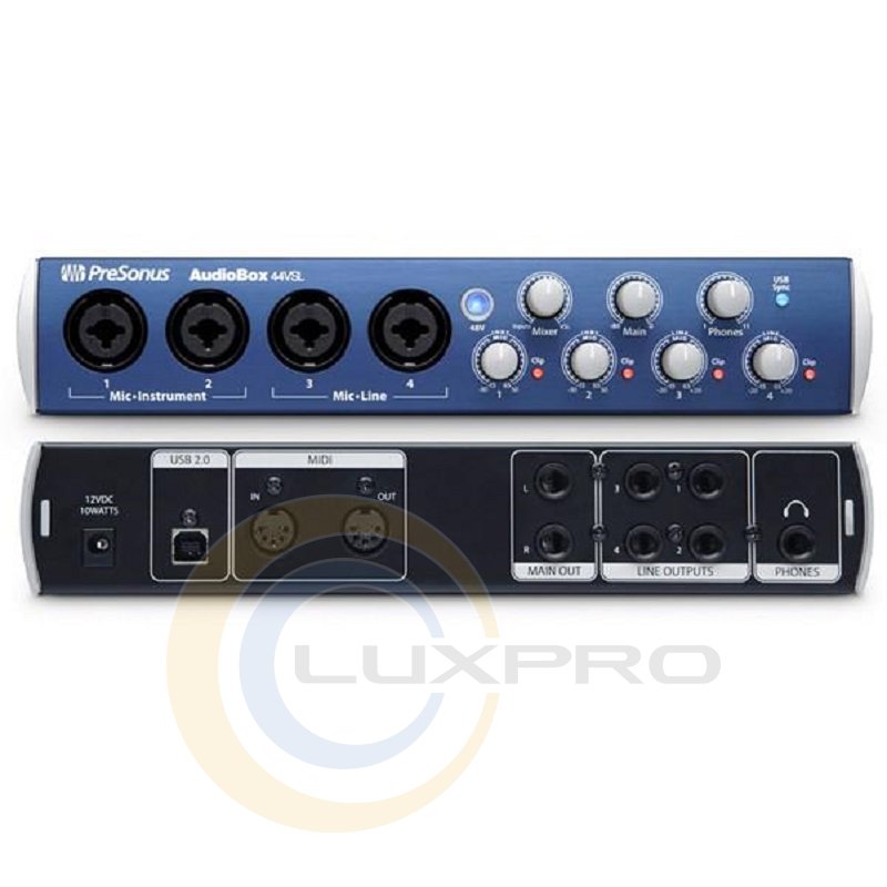 У комплект поставки з PRESONUS AUDIOBOX 44VSL входить додаток VSL, в результаті Ви отримуєте програмний мікшер з вісьмома входами і чотирма виходами. За допомогою PRESONUS AUDIOBOX 44VSL і ноутбука / персонального комп'ютера, на якому встановлена програма VSL, Ви можете записати студійну сесію або концертний виступ, гітарний дует з вокалістом, невелику групу, діджейський мікс із застосуванням стерео синтезатора або навіть ток-шоу, і все це з застосовуючи образ обробка сигналів в реальному часі або без неї. Ви зможете зробити це легко і просто без апаратного мікшера, зовнішнього процесора ефектів, без зайвих підключень завдяки винятковій інтеграції апаратного та програмного забезпечення PreSonus.Характеристики: