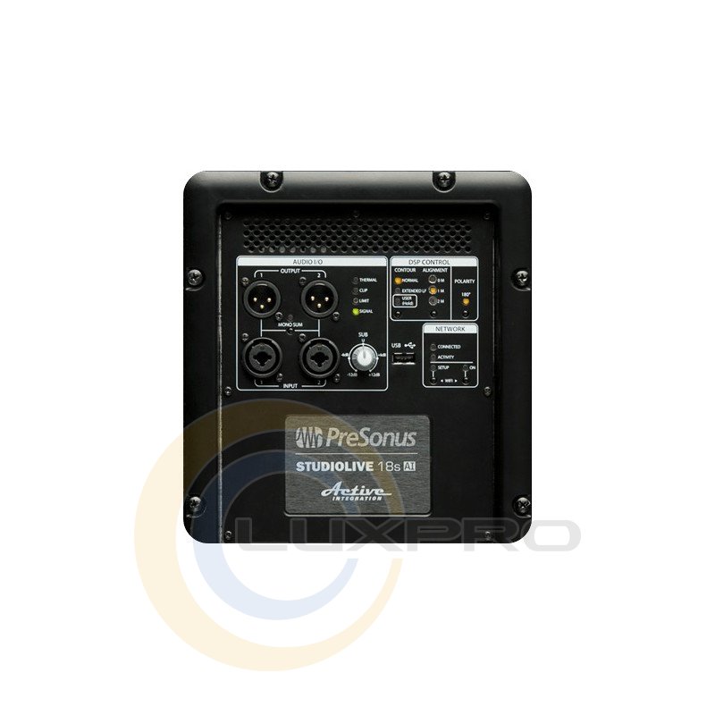 Для з'єднання з джерелами звуку на задній панелі сабвуфера PRESONUS STUDIOLIVE 18SAI є 2 комбінованих балансних роз'єму XLR / TRS 1/4, а для об'єднання в єдину систему декількох колонок 2 виходи на XLR. Для установки необхідного рівня роботи сабвуфера передбачений регулятор Sub, що працює в діапазоні від -12 до +12 дБ, а для моніторингу поточного стану є світлодіодні індикатори відображають наявність сигналу, поява перевантаження або перегріву і активізації лімітування звуку.Характеристики: