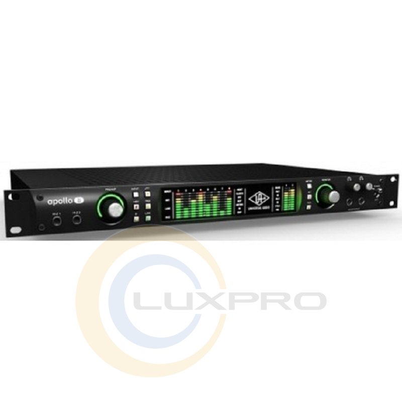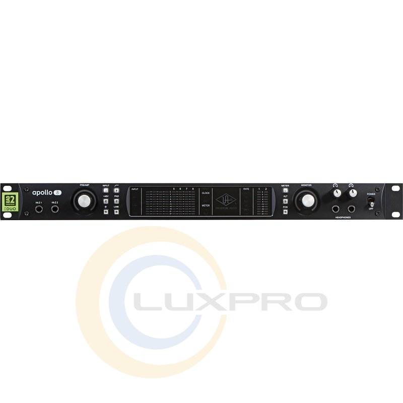 UNIVERSAL AUDIO APOLLO 8 DUO - однорековом аудіоінтерфейс для шини Thunderbolt 2, 18 входів і 24 виходу одночасно (вісім аналогових входів, в тому числі два інструментальних і чотири мікрофонних, десять лінійних виходів і два стереовиходу для навушників, восьмиканальний оптичний цифровий інтерфейс формату ADAT і двоканальний електричний інтерфейс формату SPDIF), два вбудованих DSP для плагінів формату UAD2, функції управління моніторингом. Підтримка частот дискретизації до 192 кГц, розрядності 24 біта. Додається набір плагінів Realtime Analog Classics Plus.