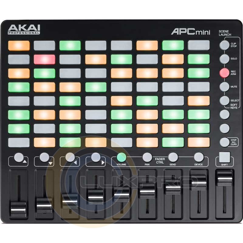 AKAI APC MINI - портативний контролер, який дуже зручний в постійних інсталяціях, але найчастіше його вибирають гастролюють музиканти. Також AKAI APC MINI можна укласти в сумку і відправитися в сусідній клуб або на фестиваль. Контролер AKAI APC MINI орієнтований на роботу з Ableton Live. Основний простір центральної консолі займають 64 кнопки, збудовані в 8 рядів по 8 штук кнопок в кожному. Кнопки призначені для запуску кліпів. Вони мають настроюється кольорову підсвітку. Крім того контролер AKAI APC MINI може запропонувати 8 призначуваних на льоту фейдеров і 1 один майстер-фейдер. Після покупки Ви виявите разом з AKAI APC MINI комплект програмного забезпечення: Ableton Live Lite, Hybrid 3 by AIR Music Tech і Toolroom Records artist launch packs (скачується самостійно з сервера AKAI PRO).
