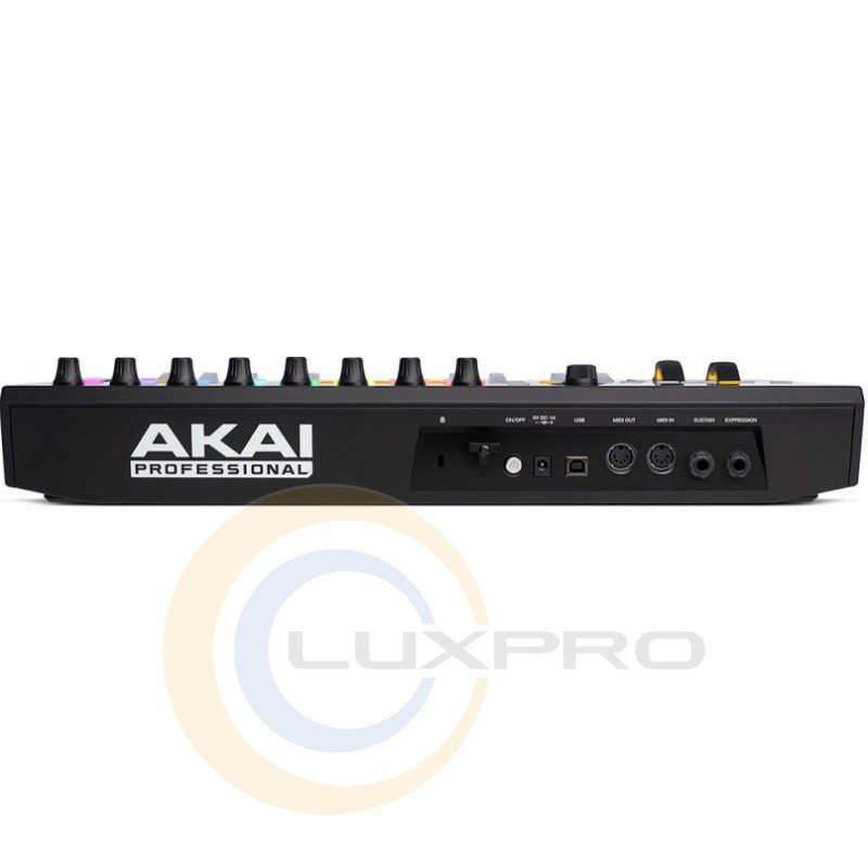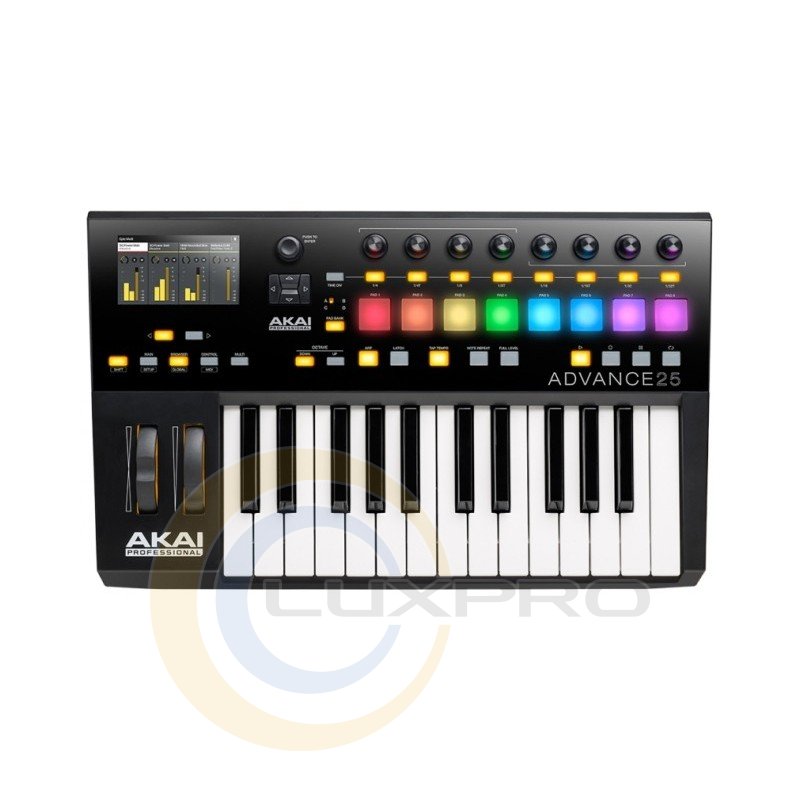 AKAI ADVANCE 25 - MIDI-клавіатура, 25 полуфортепіанних клавіш з послекасанием, колеса модуляції і висоти тону, вісім динамічних педів з послекасанием і кольоровою підсвіткою, 8 регуляторів з необмеженим обертанням, кольоровий дисплей, порт USB, MIDI-вхід і вихід. Додається хост-програма для VST-інструментів Virtual Instrument Player, яку можна використовувати автономно або як плагін формату VSTi, AU, RTAS, AAX (Windows, Mac OS). Міді клавіатура AKAI ADVANCE 25 забезпечує повноцінне керування і повну інтеграцію з програмним забезпеченням за допомогою найпопулярніших VST інструментів і DAW, а також підтримує повну відповідність реального звучання і має найпростіше управління всіма віртуальними інструментами. Управління здійснюється за допомогою дружніх елементів і візуалізується через інтерактивний повноколірний екран.