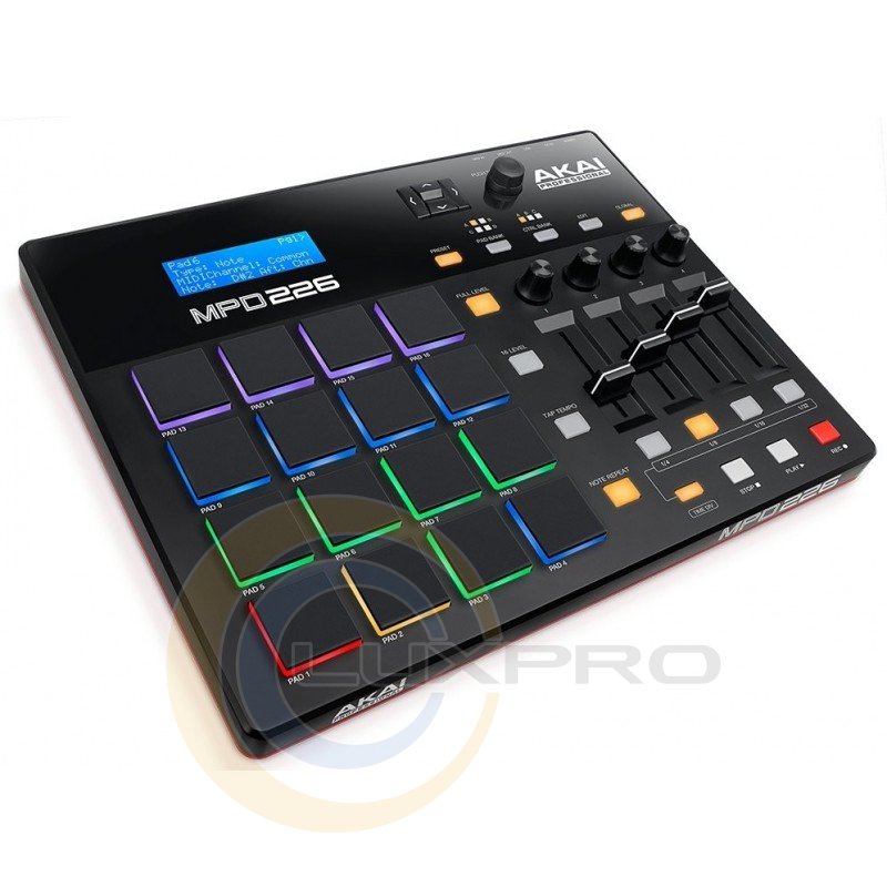 AKAI MPD226 - MIDI-контролер, 16 динамічних педів з послекасанием і кольоровою підсвіткою, чотири слайдера, чотири обертаються регулятора, чотири кнопки, органи управління транспортом, MIDI-вхід і вихід, порт USB. Сумісний з iOS-пристроями. Додаються програми Sonivox Big Bang Drums і Big Bang Cinema, Ableton Live Lite, Preset Editor. Замінює модель AKAI MPD26.