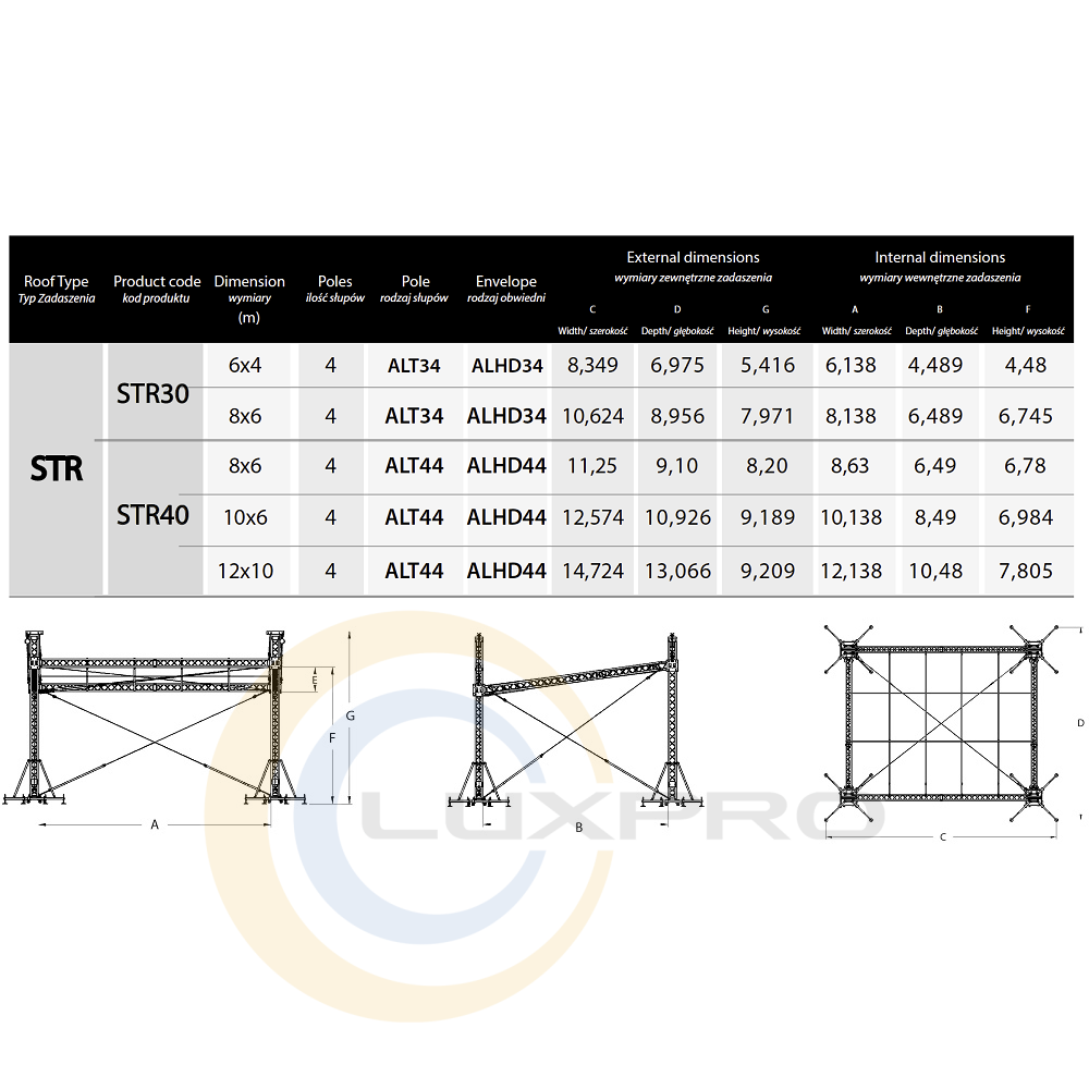 Односхилий дах був спроектований для використання під час проведення невеликих заходів. Дахи STR призначені для заходів під відкритим небом середнього розміру. Сучасні дахи можуть бути зібрані дуже швидко. Підстава конструкції виконано із застосуванням системи QUA 290 HD3 (товщина стінки 3 мм), однак, є можливість виконання конструкції із застосуванням системи QUA 390 x 600, що значно збільшує вантажопідйомність даху. Обшивка даху виготовлена з ПВХ-матеріалу, доступного в різних кольорах. Крім того, для кожної даху можна замовити додаткові бічні екрани (сітки) з повітропроникного матеріалу, які захищають сцену від вітру, дощу і т.д. Бічні екрани і обшивка даху мають сертифікати на вогнестійкість. Кожна дах має найвищу якість. Кожен елемент ретельно перевіряється. Як бічні сітки, так і матеріал поверхні даху мають сертифікати пожежної безпеки, якість матеріалів, з яких виготовлений дах, знаходиться на найвищому рівні і виправдає всі очікування. За бажанням замовника можна провести детальний структурний аналіз, щоб підтвердити допустиме навантаження.