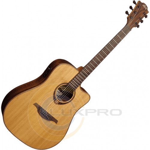 Lag Tramontane T118DCE - це шестиструнна електроакустична гітара в корпусі дредноут. Ця модель має елегантний зовнішній вигляд, а найголовніше, чудовий звук, який досягається завдяки поєднанню цільної деревини червоного кедра (верхня дека) та африканського сапелі (обичайки та нижня дека). Гриф зроблений з тропічної хайї та має якісну накладку з коричневого дерева. Голова грифа та бридж також виконані з коричневого дерева. Верхній та нижній поріжки зроблені з чорного графіту та мають розміри відповідно 43 та 72 мм. Мензура гітари складає 650 мм. На грифі є 20 ладів без інкрустації. Також гітара може похвалитися двостороннім анкером, закритими колками (Die Cast), вишуканою декоративною інкрустацією розетки та логотипом на голові грифа виконаного з клена, а також 3-смуговою системою підсилювача EQ з тюнером. Модель представлена у натуральному кольорі з глянсовим покриттям.Характеристики: