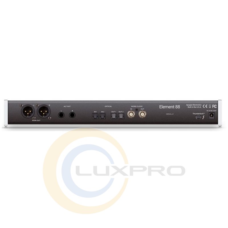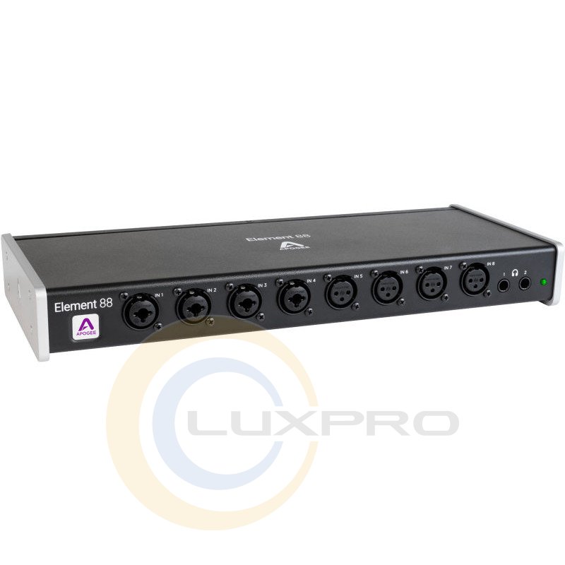 APOGEE ELEMENT 88 - професійний аудіо-інтерфейс на 16 входів і 16 виходів спеціально розробленим для шини Thunderbolt. На борту Element 88 встановлені підсилювачі преміум класу, а також високоякісні аналого-цифрові і цифро-аналогові перетворювачі, які використовуються у флагмані Apogee Ensemble. Особливістю даної моделі є відсутність регуляторів на корпусі аудіо-інтерфейсу, всі налаштування і регулювання відбувається в спеціальному ПО Element Control. Також передбачений додатковий, опціональний контролер ПДУ Control Hardware і є можливість бездротової настройки через пристрої на базі iOS. Як і в професійних аудіо картах, дана модель має частоту дискретизації 192 кГц / 24 біт, а також має наднизьку затримку 1,41 мс.особливості: