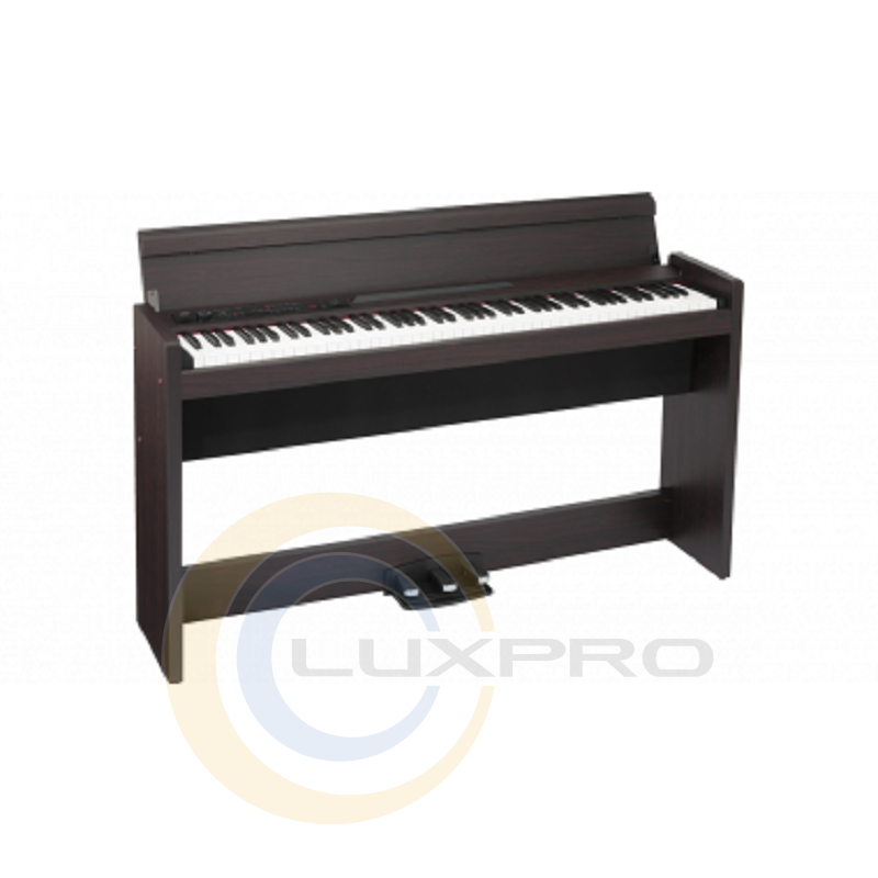 Цифрове піаніно KORG LP-380-RW BK - гарантує автентичний звук рояля. Піаніно KORG LP-380-RW BK колір палісандр виконано в елегантному і стильному корпусі. KORG LP-380-RW BK - це чудовий звук рояля і низькопрофільний витончений дизайн корпусу. Корпус з плоским верхом має стильний зовнішній вигляд навіть при закритій кришці клавіатури. Потужний підсилювач і динаміки виключно реалістично відтворюють звук рояля. Молоточковая клавіатура RH3, три педалі і динаміки великого діаметра забезпечують багате звучання фортепіано та природні відчуття від гри на піаніно.Для того щоб максимально можливо наблизити звук електропіаніно до звуку акустичного фортепіано, в залежності від динаміки виконання використовується перемикання між чотирма різними семплами. Від самого ніжного піанісімо до потужного крещендо - звук цього інструменту завжди чуйно реагує на найменші нюанси виконання. Зокрема, тембри Classic Piano і Grand Piano реалістично відтворюють ефект симпатичного резонансу, що виникає при натисканні правої педалі акустичного фортепіано, що робить загальне звучання ще більш приємним і натуральним.Цифрове піаніно KORG LP-380-RW BK відзначається неповторним стилем і органічно вписується в інтер'єр будь-якої кімнати. Глибина корпусу складає всього лише 26 сантиметрів, таким чином, електропіаніно не займає багато місця. Плоска зверху дерев'яна кришка клавіатури забезпечує бездоганний зовнішній вигляд і не приваблює зайвої уваги, коли цифрове піаніно KORG LP-380-RW BK не використовується. З метою безпеки в конструкції застосований механізм плавного закривання кришки.Характеристики: