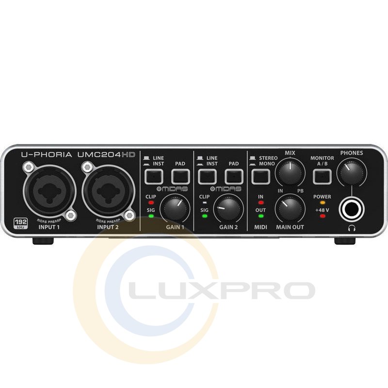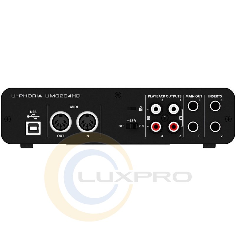 BEHRINGER UMC204HD - компактний звуковий інтерфейс 2 × 4 для шини USB 2.0. Виробником заявлена сумісність пристрою з операційними системами Mac OS і Windows, а також з програмним забезпеченням Steinberg Cubase, Ableton Live, Avid Pro Tools і т. д.