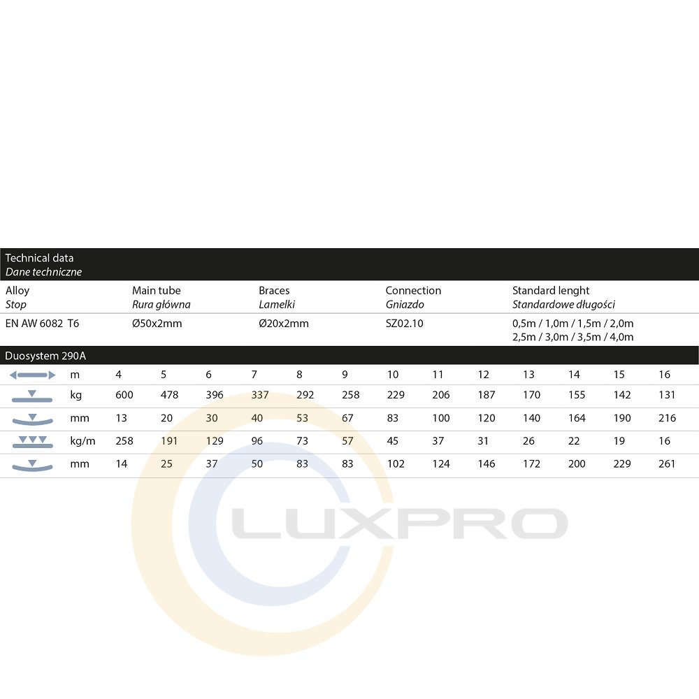 Ферма DUO 290 A виконана з труби 50 x 2 мм і перемичок 20 x 2 мм, обладнана конічним коннектором - гніздом SZ 02.10. Алюмінієва ферма завдяки своїй конструкції має привабливий, не громіздкий вигляд і велику витривалість, високу стійкість до впливу на них великих навантажень. Із застосуванням наших систем можна створювати різноманітні конструкції в залежності від поставленої мети. У тому числі алюмінієві ферми можуть бути підставою конструкції даху сцени, можуть застосовуватися для створення конструкцій виставкових павільйонів, конструкцій для кріплення проекційних і LED екранів, секцій для розташування звукового і освітлювального устаткування. Якість кожної ферми знаходиться на максимально можливому для подібного виду виробів рівні, що підтверджено сертифікатами ISO DIN 4113 і TUV, а кожен елемент пройшов кілька стадій перевірки якості.