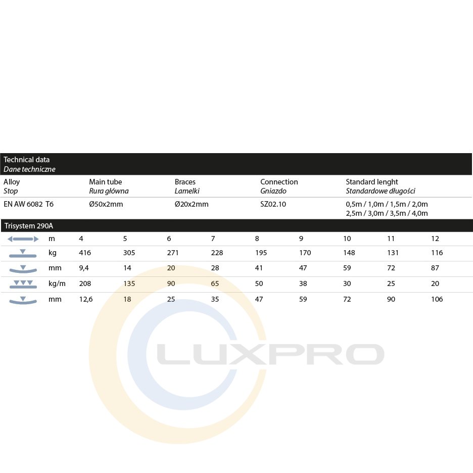 Ферма TRI 290 A виконана з труби 50 x 2 мм і перемичок 20 x 2 мм, обладнана конічним коннектором - гніздом SZ 02.10. Алюмінієва ферма завдяки своїй конструкції має привабливий, не громіздкий вигляд і велику витривалість, високу стійкість до впливу на них великих навантажень. Із застосуванням наших систем можна створювати різноманітні конструкції в залежності від поставленої мети. У тому числі алюмінієві ферми можуть бути підставою конструкції даху сцени, можуть застосовуватися для створення конструкцій виставкових павільйонів, конструкцій для кріплення проекційних і LED екранів, секцій для розташування звукового і освітлювального устаткування. Якість кожної ферми знаходиться на максимально можливому для подібного виду виробів рівні, що підтверджено сертифікатами ISO DIN 4113 і TUV, а кожен елемент пройшов кілька стадій перевірки якості.